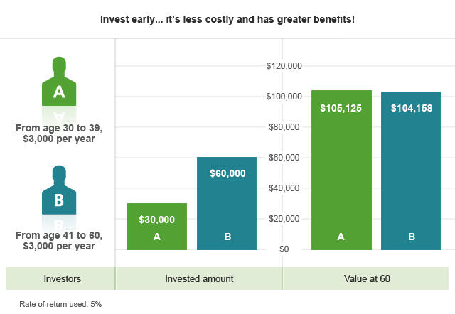 Time is on your side! For example, with similar returns, an investor who contributes $3,000 per year from age 30 to 39 (or $30,000 over 10 years) will normally accumulate a higher amount than another investor who contributes the same amount each year from age 41 to 60 (or $60,000 over 20 years).
