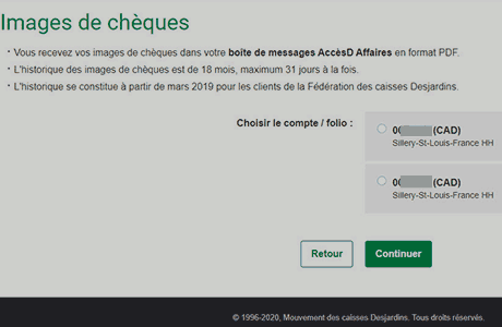 Vous pouvez faire le suivi de vos chèques et les visualiser dans AccèsD Affaires dès qu’ils sont traités, grâce au service d’imagerie de chèques :