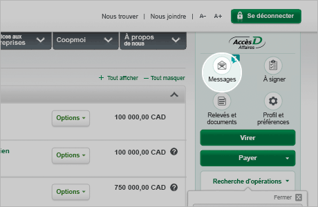 Bénéficiez d’un menu simplifié pour gérer les comptes de votre entreprise. Voyez comment naviguer dans AccèsD Affaires.