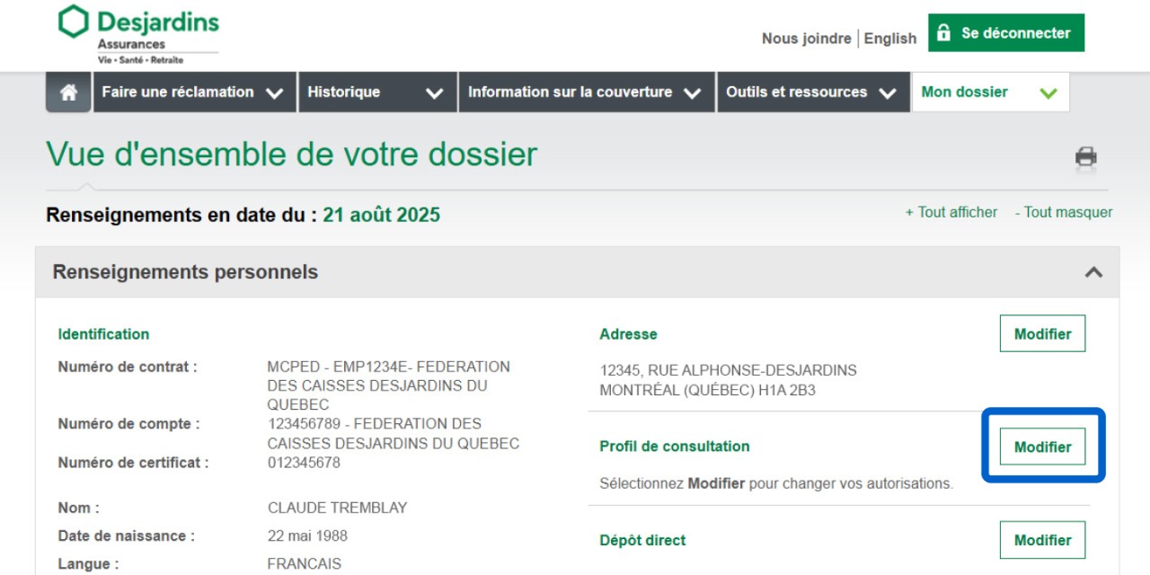 Dans la section Renseignements personnels, sous Profil de consultation, sélectionnez le bouton Modifier.