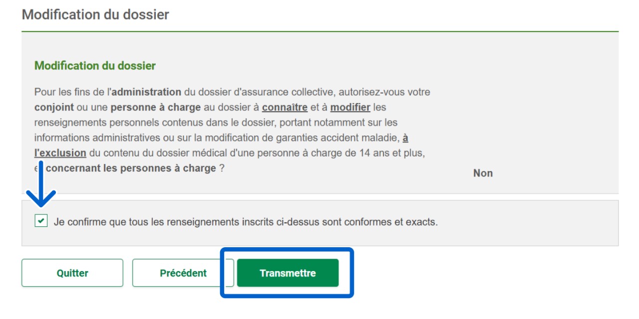 Vérifiez les informations pour autoriser la consultation et la modification du dossier d’assurance, cochez la case, puis sélectionnez le bouton Transmettre pour confirmer votre autorisation.