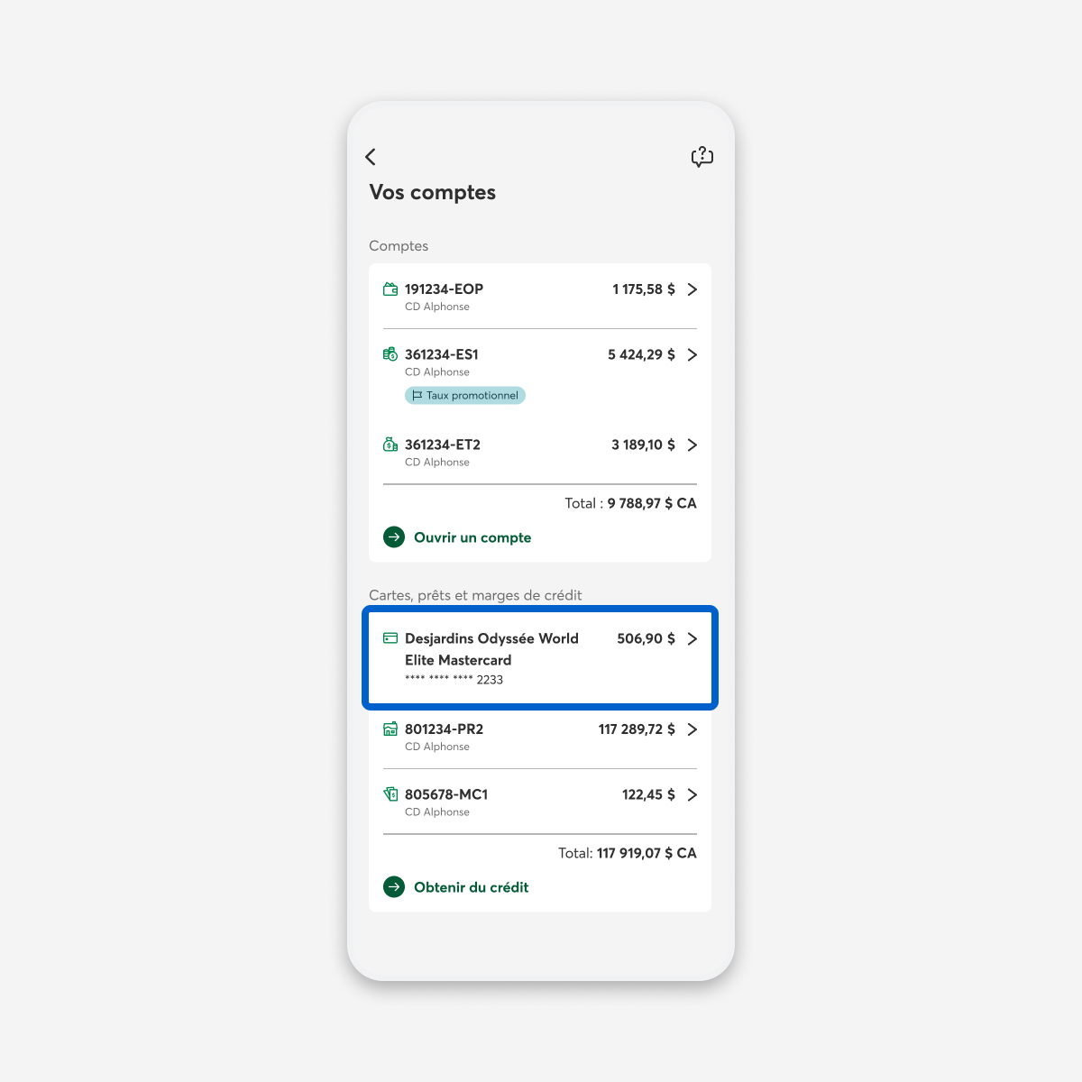 Dans la page Vos comptes, sous Cartes, prêts et marges de crédit, sélectionnez la carte de crédit pour laquelle vous voulez changer le NIP.