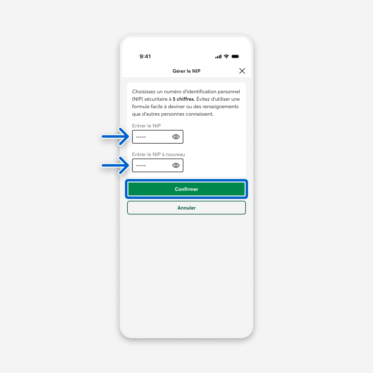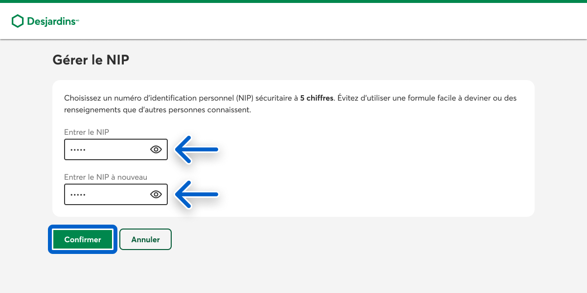 Entrez votre nouveau NIP 2 fois, puis sélectionnez le bouton Confirmer pour terminer le changement de NIP.