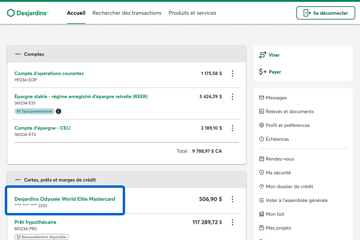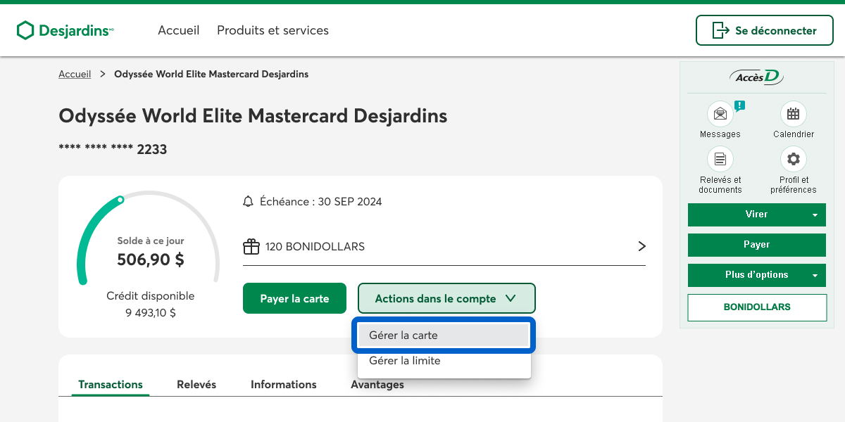 Dans la page d’accueil d’AccèsD, sous Cartes, prêts et marges de crédit, sélectionnez la carte de crédit pour laquelle vous voulez changer le NIP.