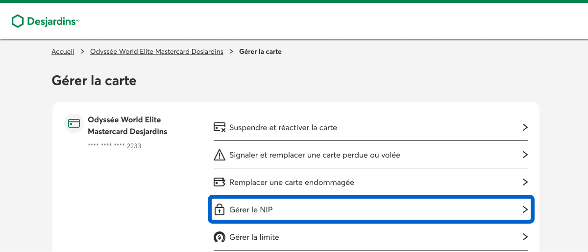 Dans la page Gérer la carte, sélectionnez le lien Gérer le NIP.