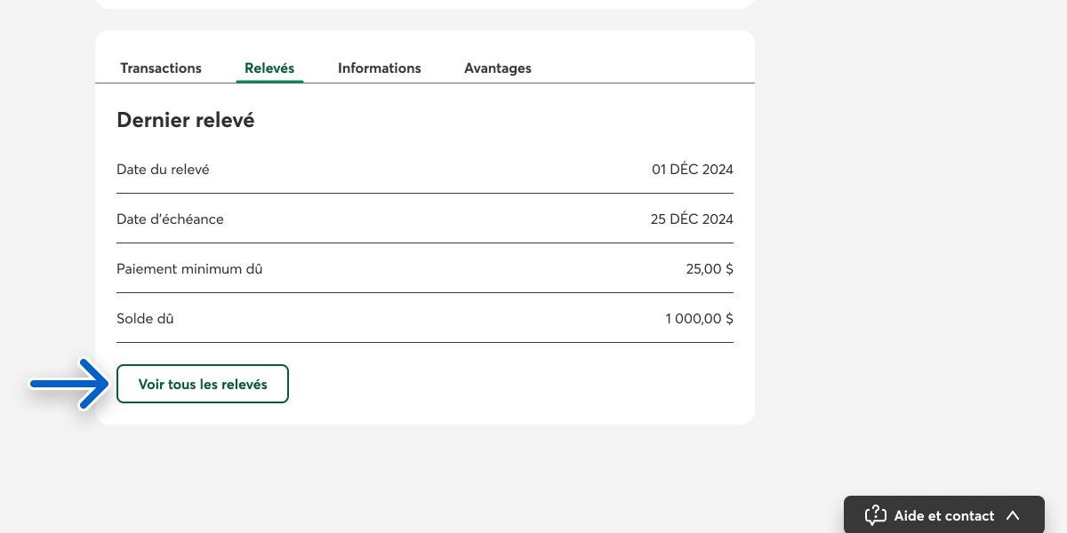 Dans la section Dernier relevé, sélectionnez le bouton Voir le dernier relevé.
