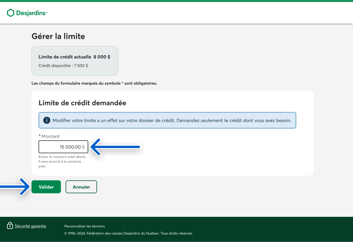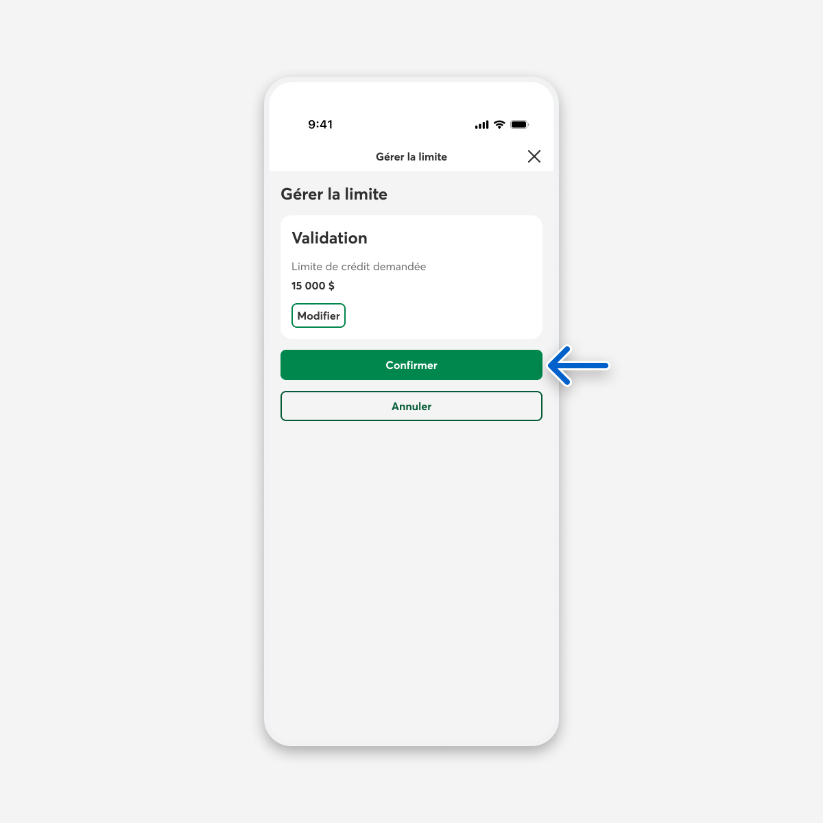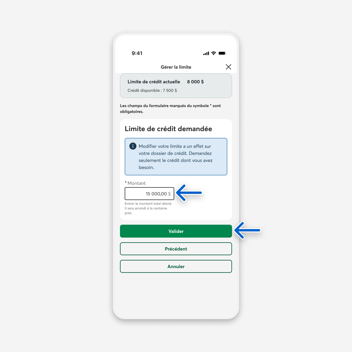 Dans la page Gérer la limite, entrez le montant désiré de votre nouvelle limite de crédit et sélectionnez le bouton Valider.