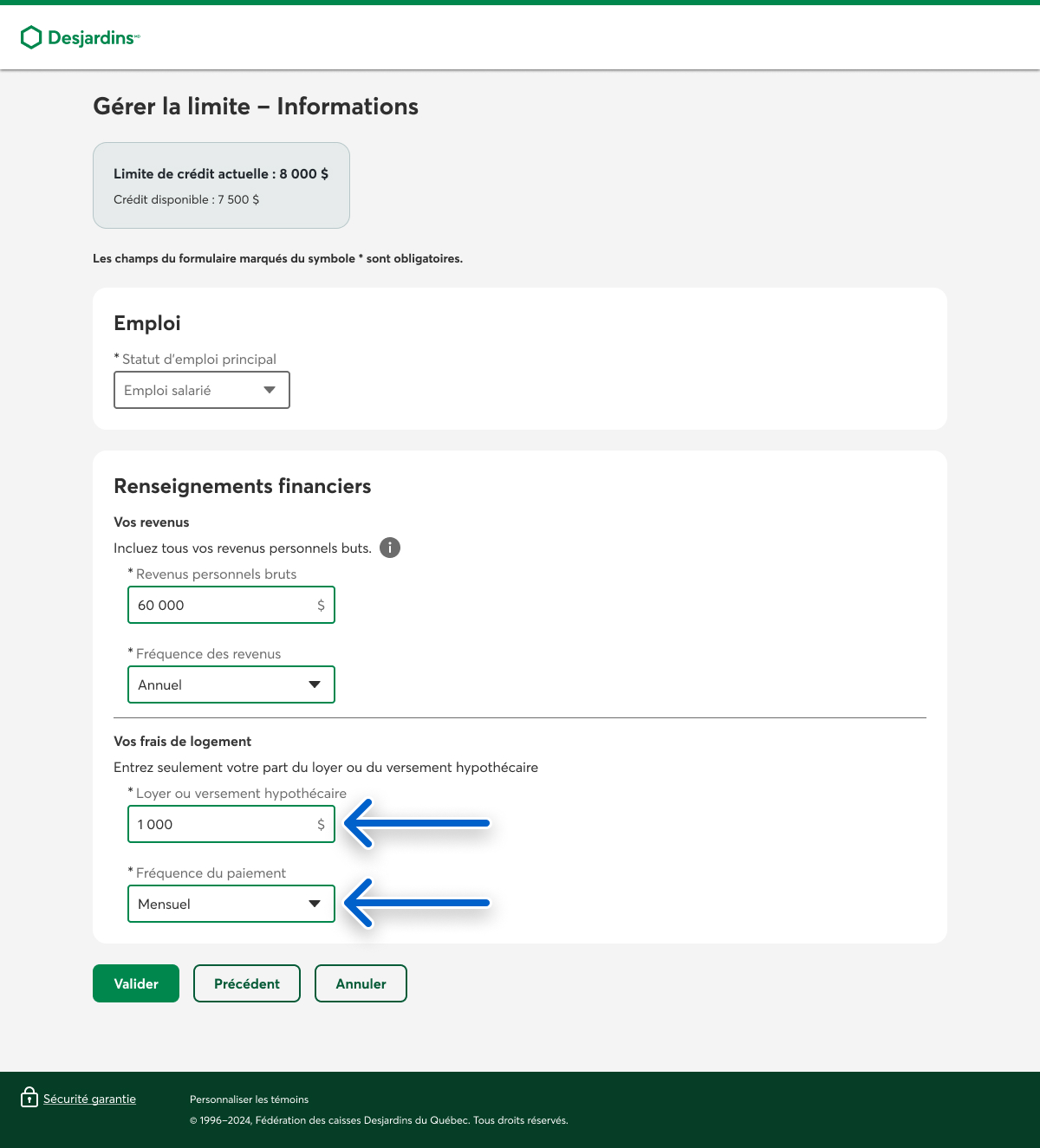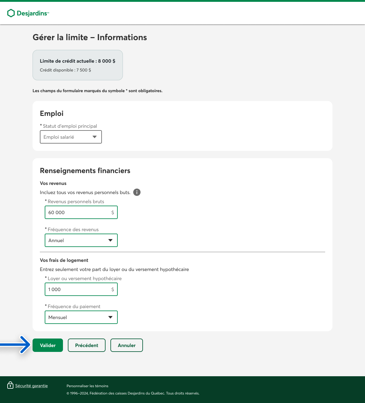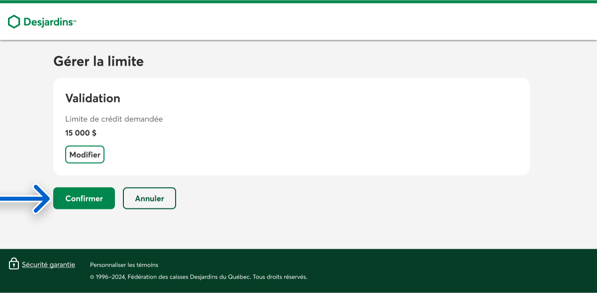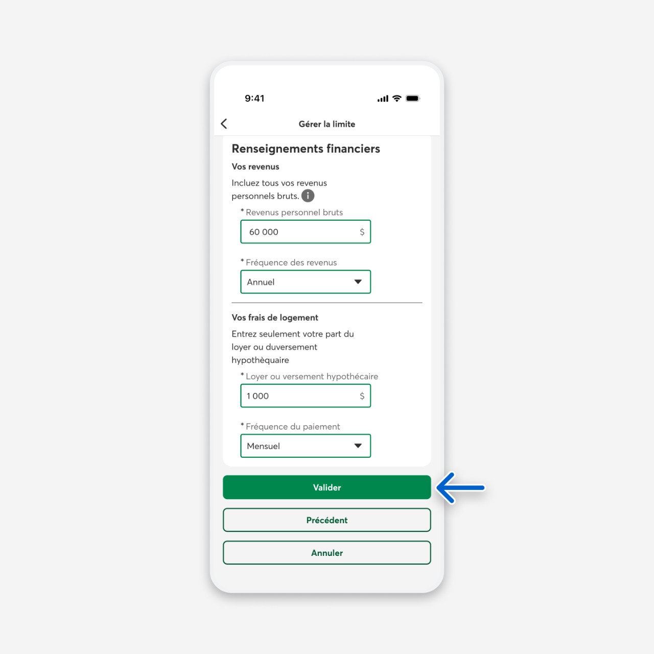 Dans la page Gérer la limite, entrez le montant désiré de votre nouvelle limite de crédit et sélectionnez le bouton Valider.