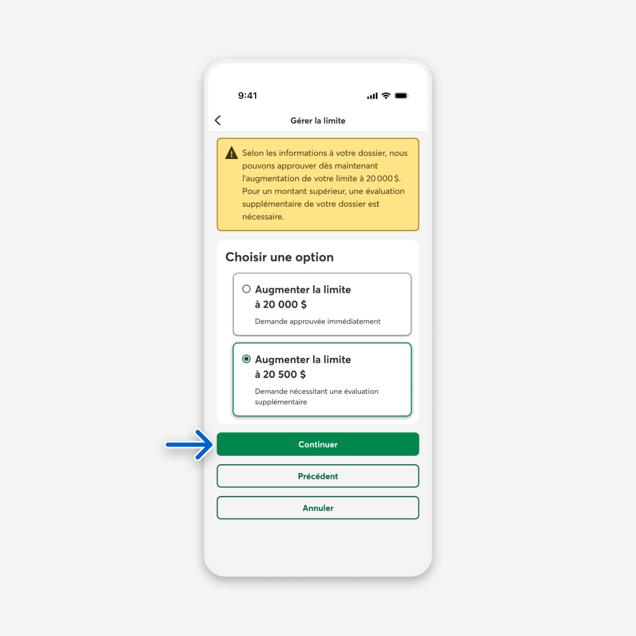 Dans la page Gérer la limite – Choisir un montant, si vous pouvez profiter d’une limite plus élevée, la section Choisir une option apparaît. Vous pouvez sélectionner le montant préapprouvé que nous vous proposons ou un montant supérieur qui nécessite une évaluation supplémentaire.