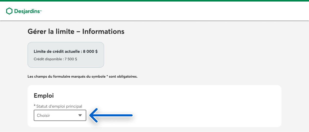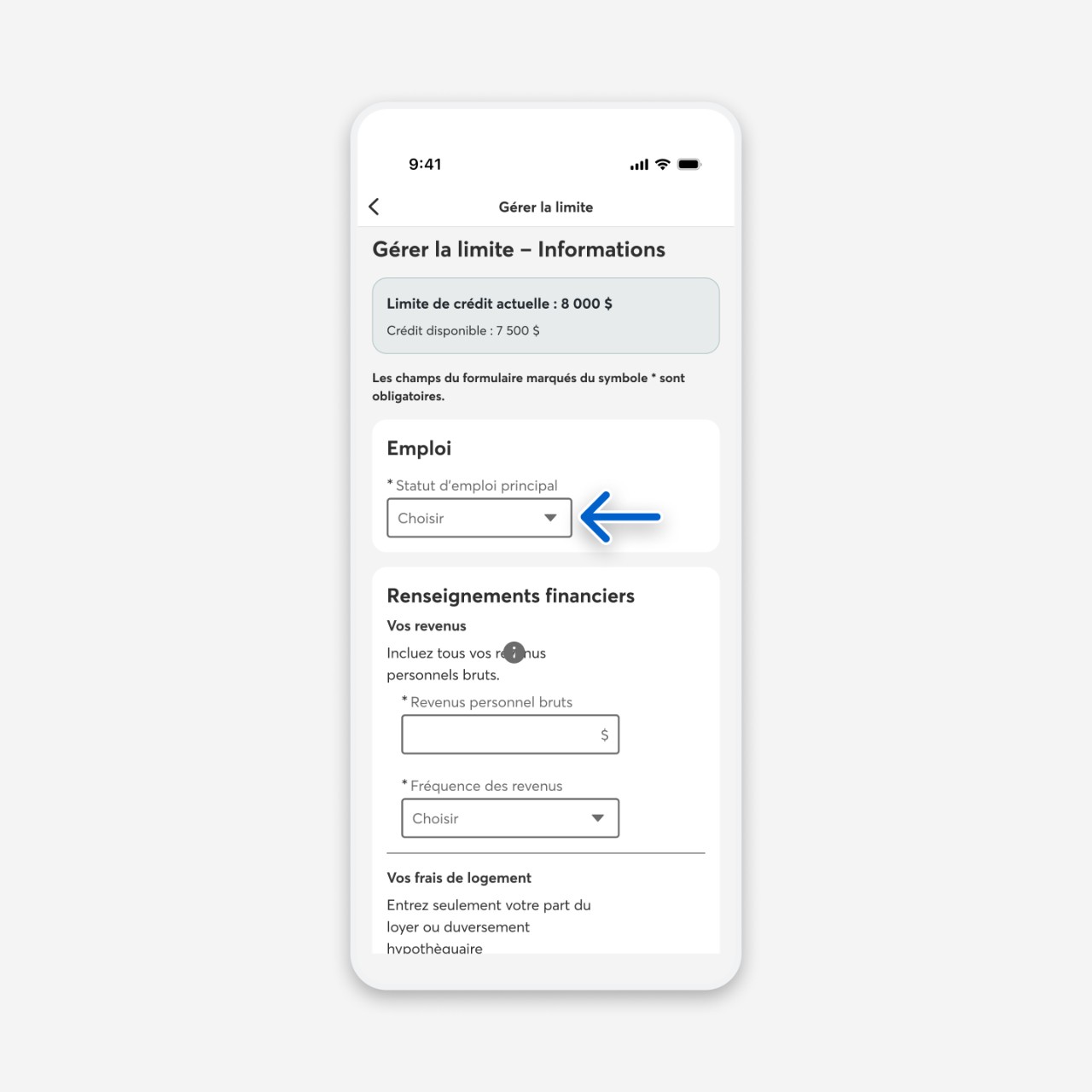 Dans la page Gérer la limite – Informations, sous Emploi, sélectionnez votre statut d’emploi principal dans le bouton de menu.