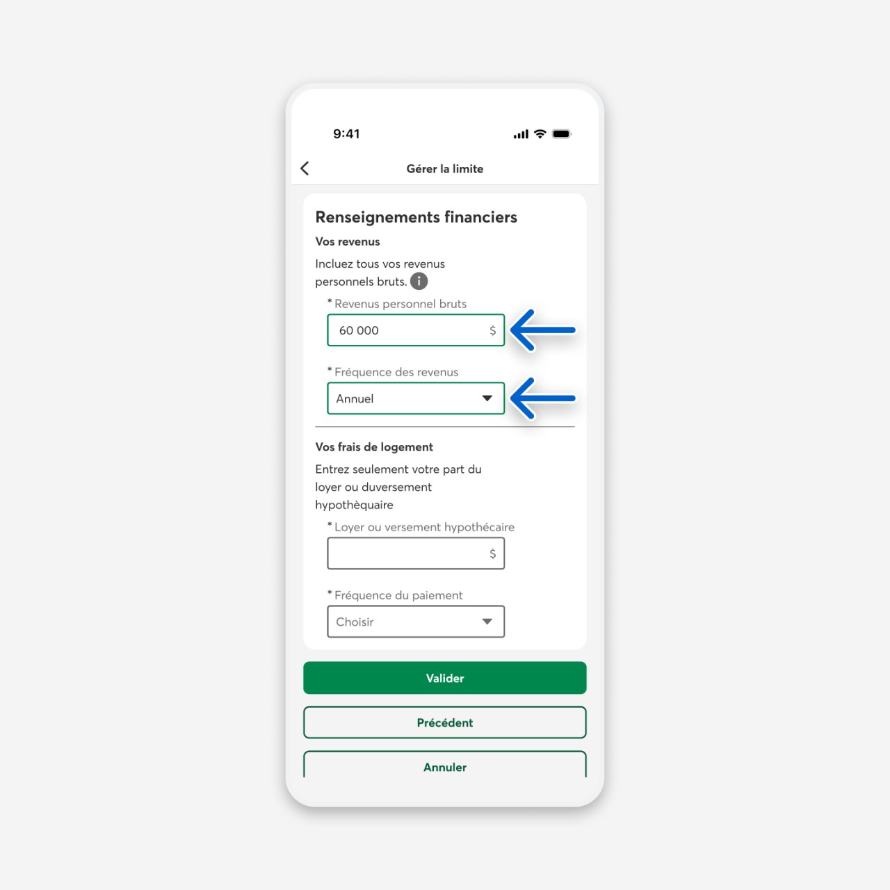 Dans la section Renseignements financiers, sous Vos revenus, entrez vos informations dans le champ Revenus personnels bruts, puis indiquez la fréquence des revenus en sélectionnant le bouton de menu.