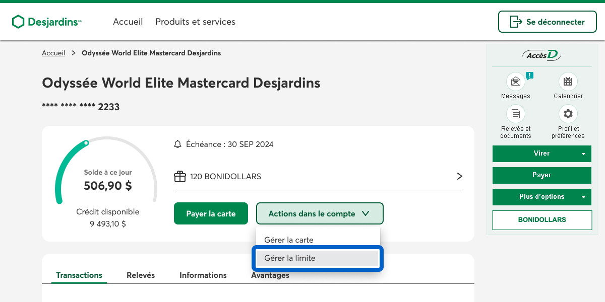Dans la page d’accueil d’AccèsD, sous Cartes, prêts et marges de crédit, sélectionnez la carte de crédit pour laquelle vous voulez gérer la limite de crédit.