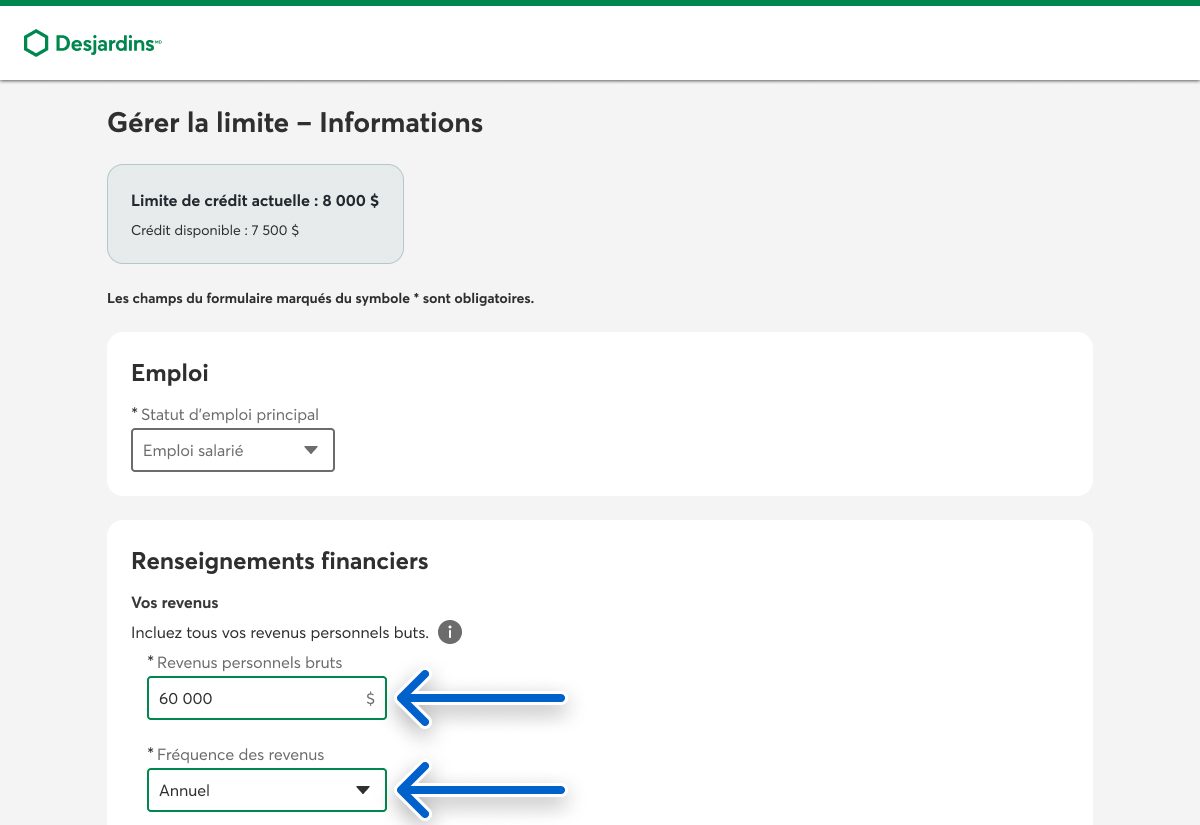 Dans la page Gérer la limite – Informations, sous Emploi, sélectionnez votre statut d’emploi principal dans la liste déroulante.