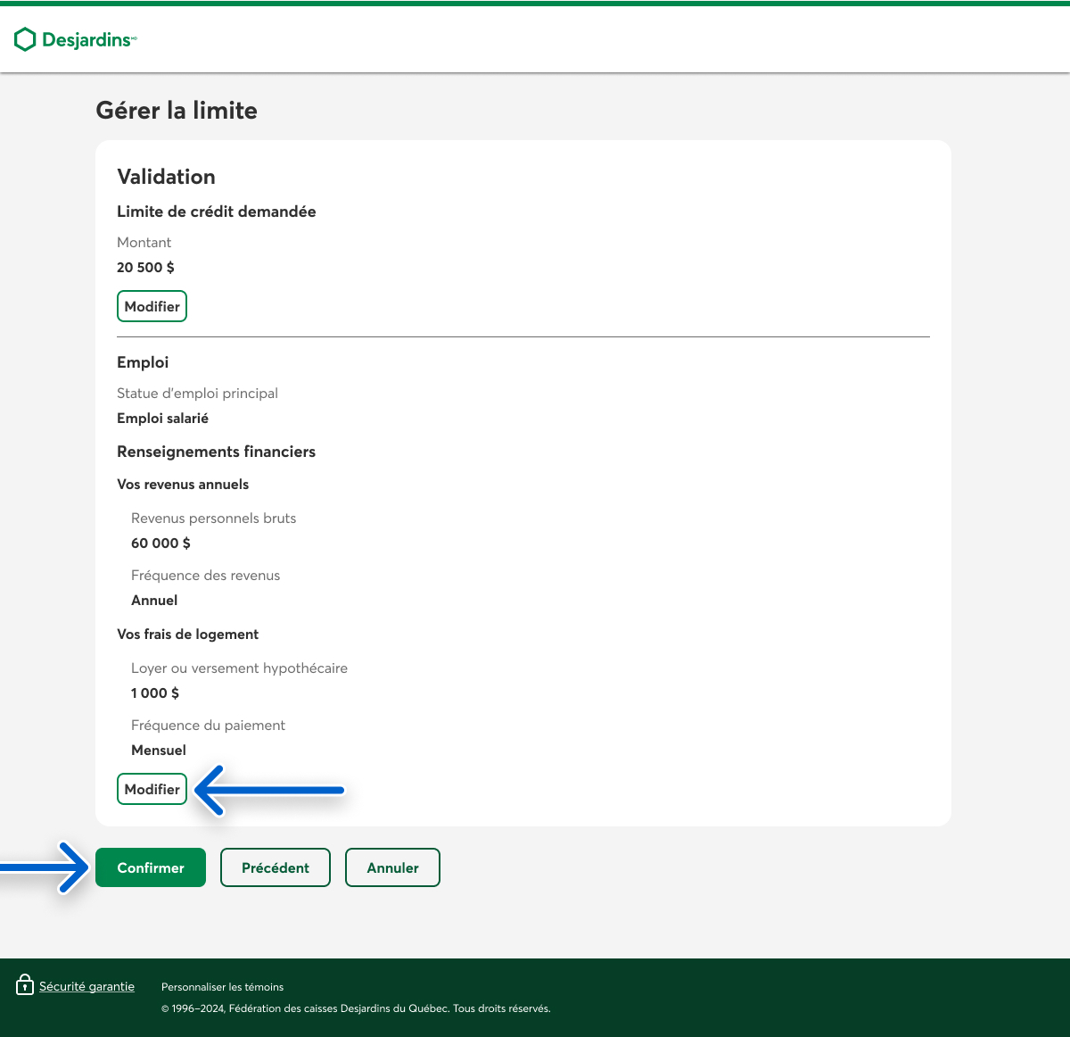 Validez les informations de votre demande, puis sélectionnez le bouton Confirmer. Vous pouvez changer vos informations en sélectionnant le bouton Modifier sous chacune des sections.