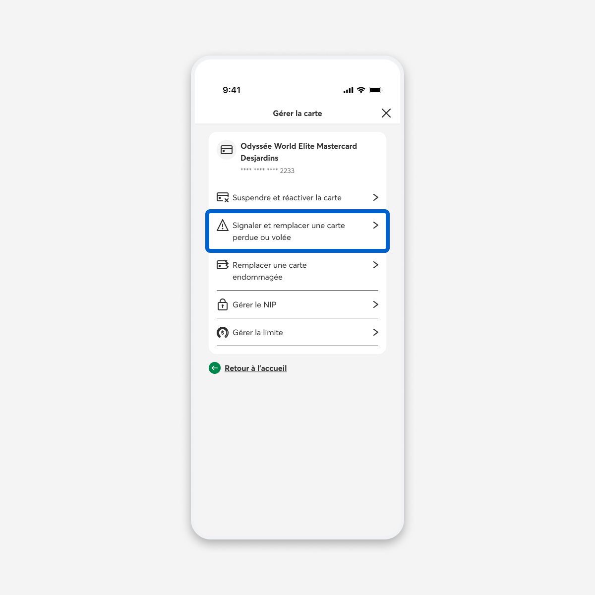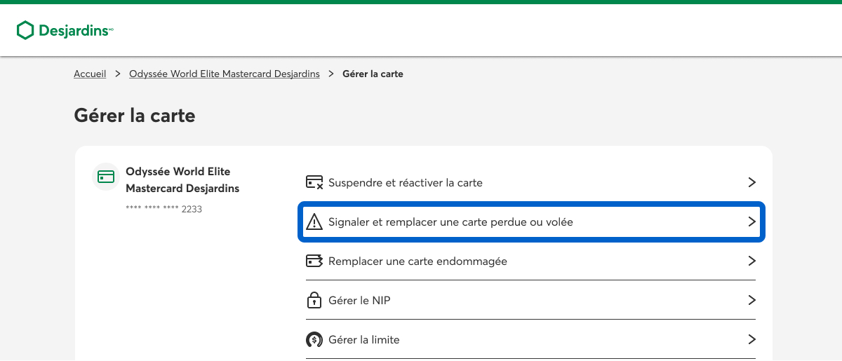 Dans la page Gérer la carte, sélectionnez le lien Signaler et remplacer une carte perdue ou volée.