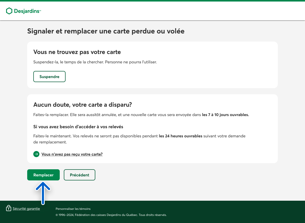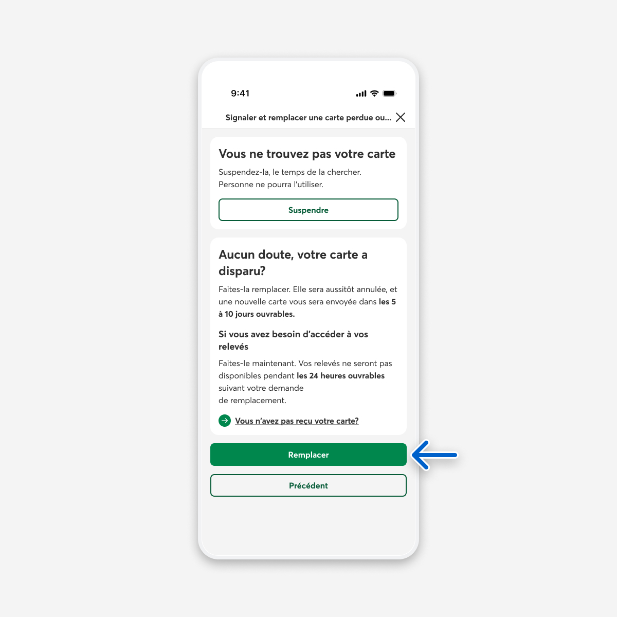Dans la page Signaler et remplacer une carte perdue ou volée, sélectionnez le bouton Remplacer.