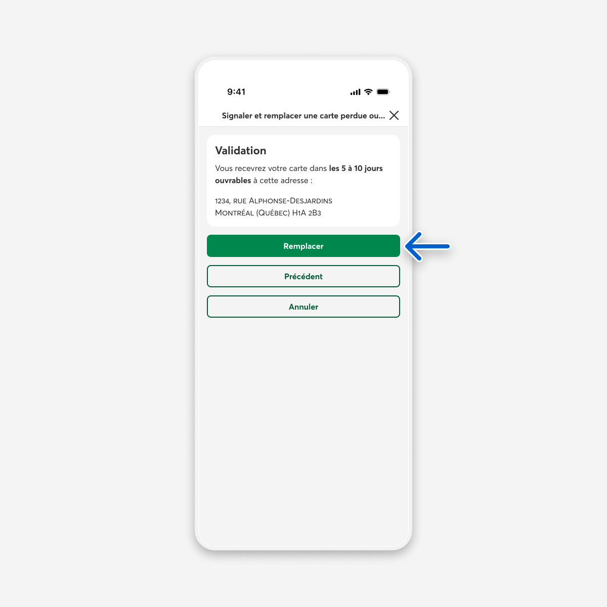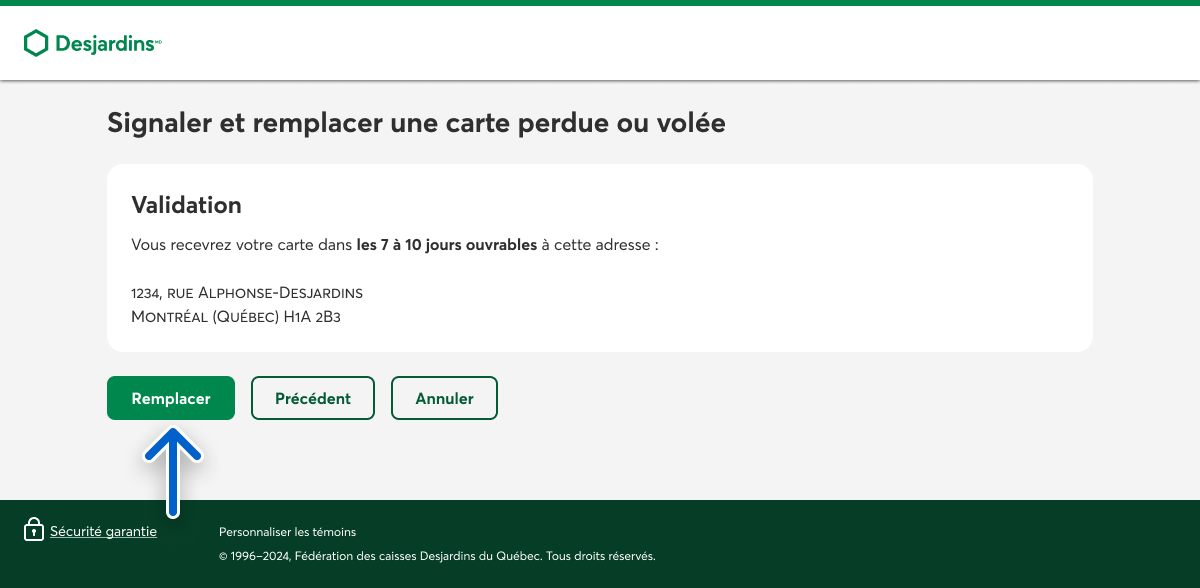 Validez les informations pour l’envoi de votre nouvelle carte, puis sélectionnez le bouton Remplacer.