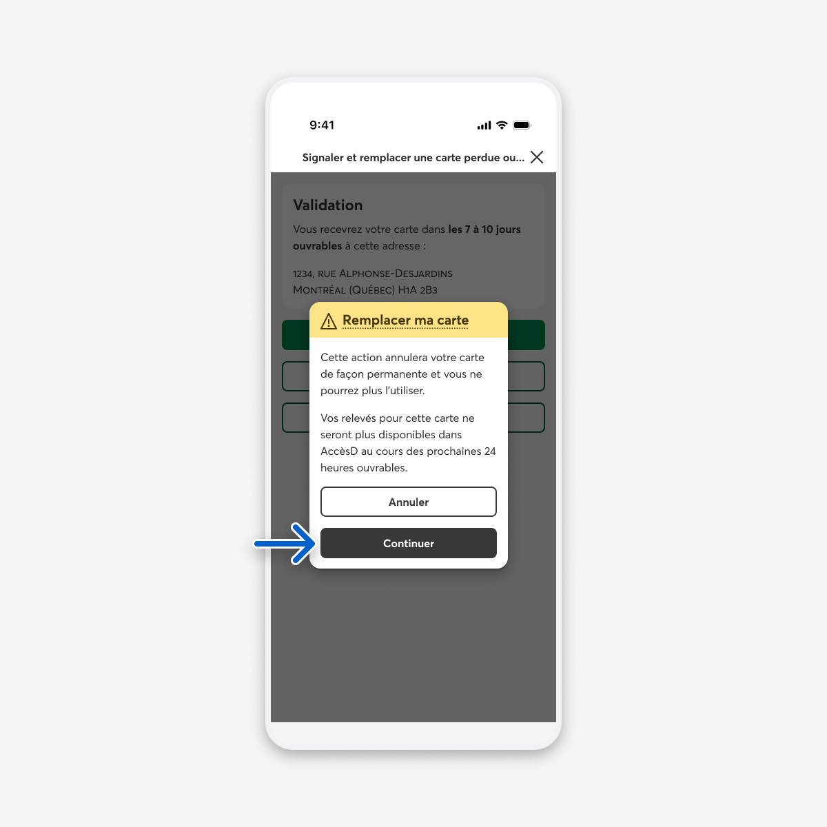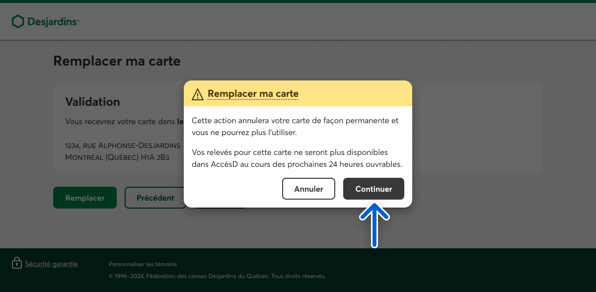 Dans le message d’avertissement Remplacer ma carte, sélectionnez le bouton Continuer pour compléter votre demande.