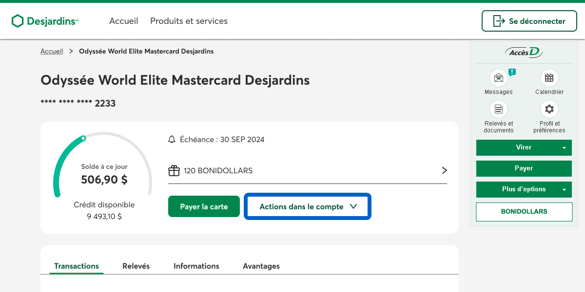 Dans la page d’accueil d’AccèsD, sous Cartes, prêts et marges de crédit, sélectionnez la carte de crédit que vous voulez remplacer.