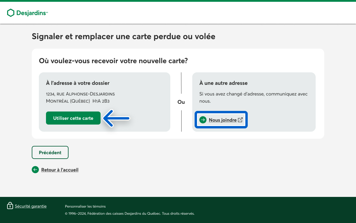 Pour recevoir votre nouvelle carte de crédit à l’adresse indiquée à votre dossier, sélectionnez le bouton Utiliser cette adresse. Pour l'envoyer à une autre adresse, sélectionnez le lien Nous joindre pour communiquer avec nous et mettre à jour votre profil.