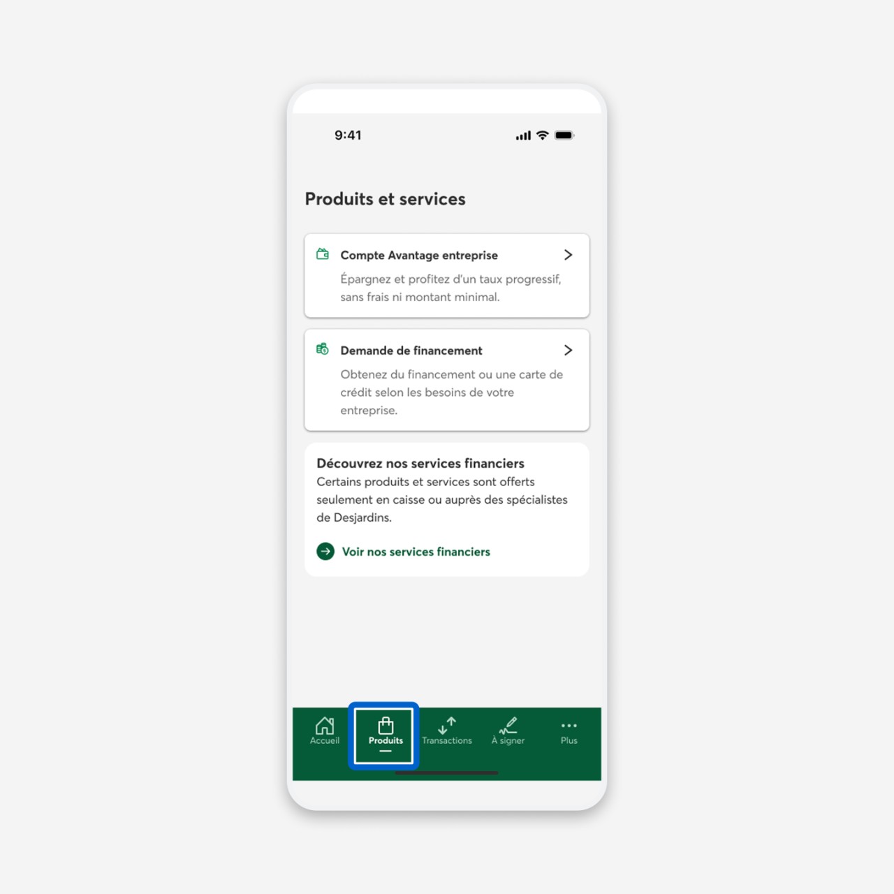 Vous voulez ouvrir un compte d’épargne, faire une demande de carte de crédit ou de financement? Voyez tous nos produits et services offerts en ligne pour votre entreprise sous l’onglet Produits.