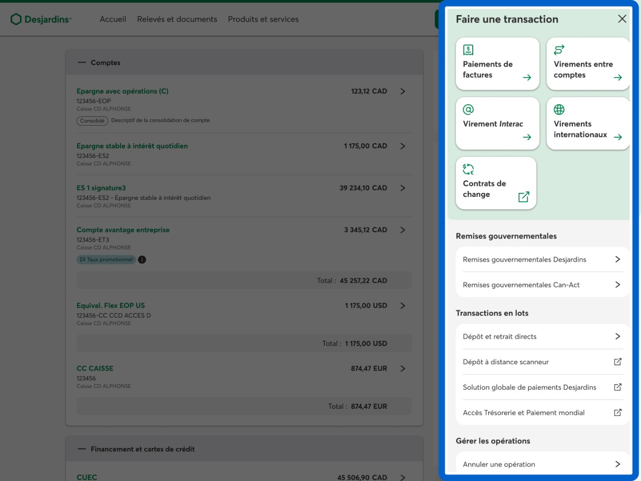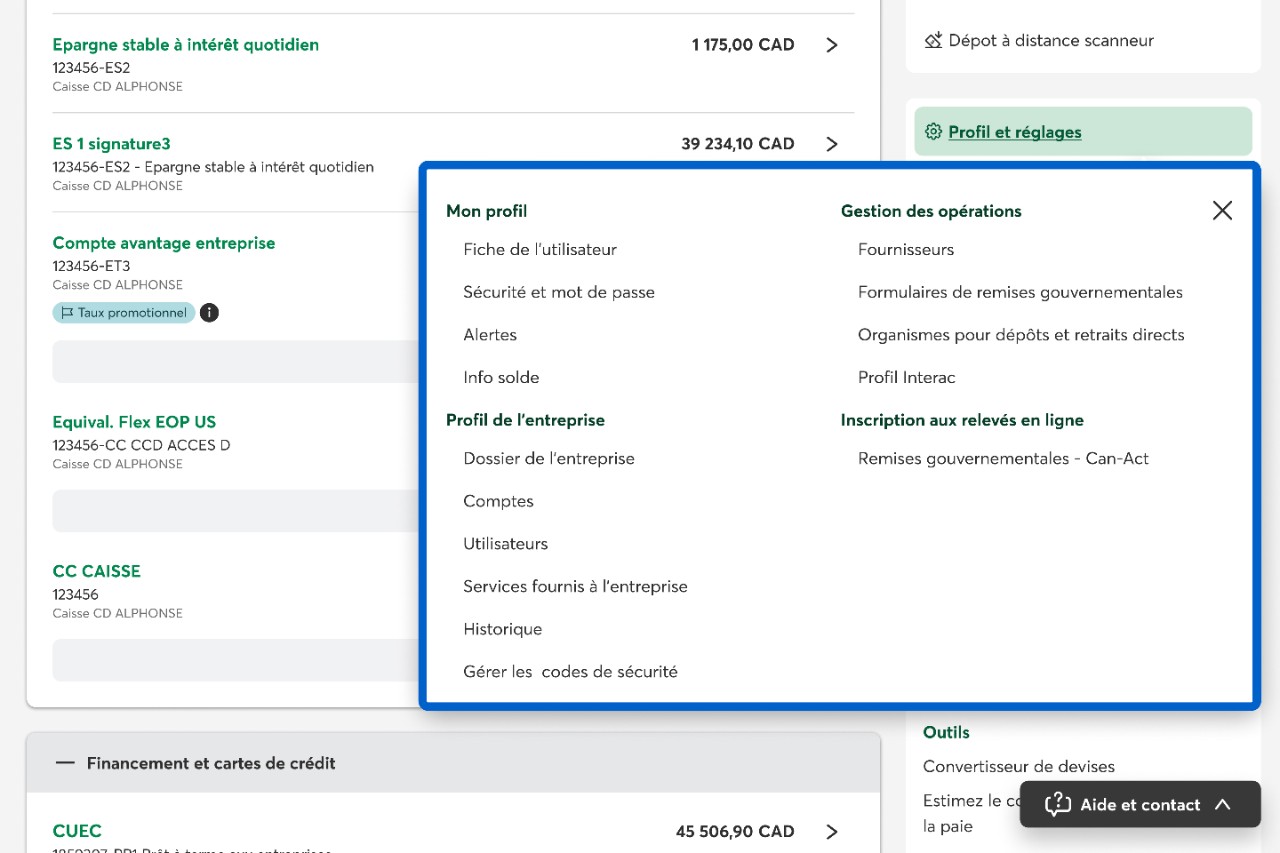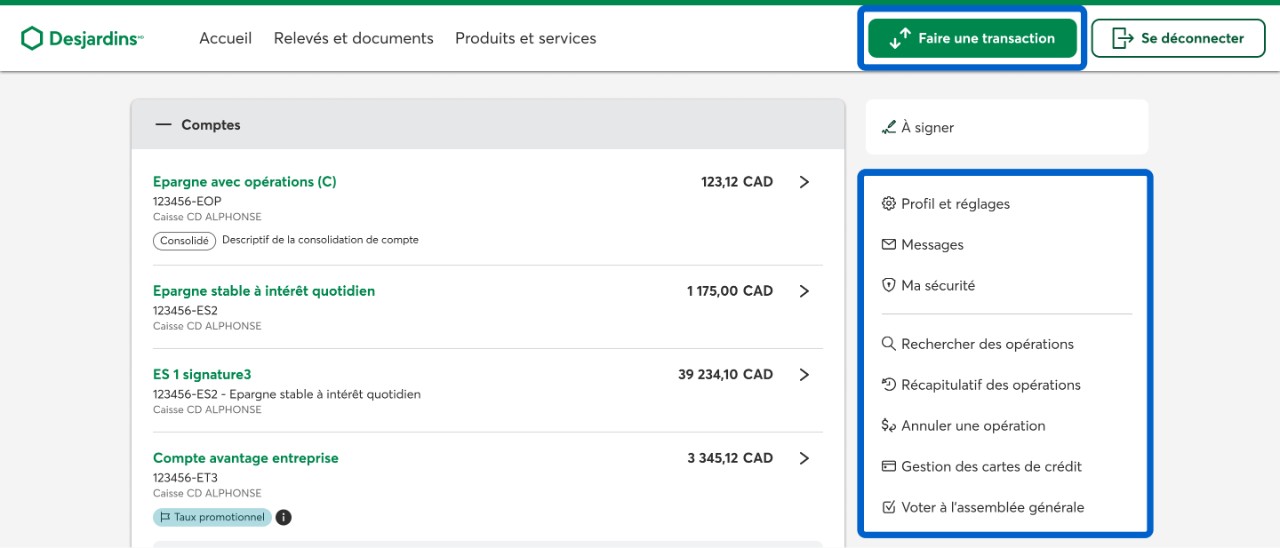 Pour naviguer dans AccèsD Affaires sur le Web, utilisez le bouton Faire une transaction et le menu d’options principales et secondaires situés à droite de votre écran d’accueil. Ils regroupent toutes les fonctionnalités utiles pour gérer les comptes de votre entreprise.