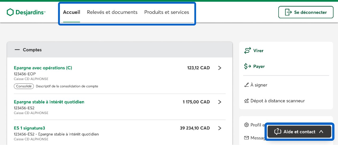 Sous le même onglet, dans la barre supérieure de l’écran, sélectionnez le bouton Se déconnecter pour fermer votre session en toute sécurité. Le bouton Aide et contact permet de nous joindre.