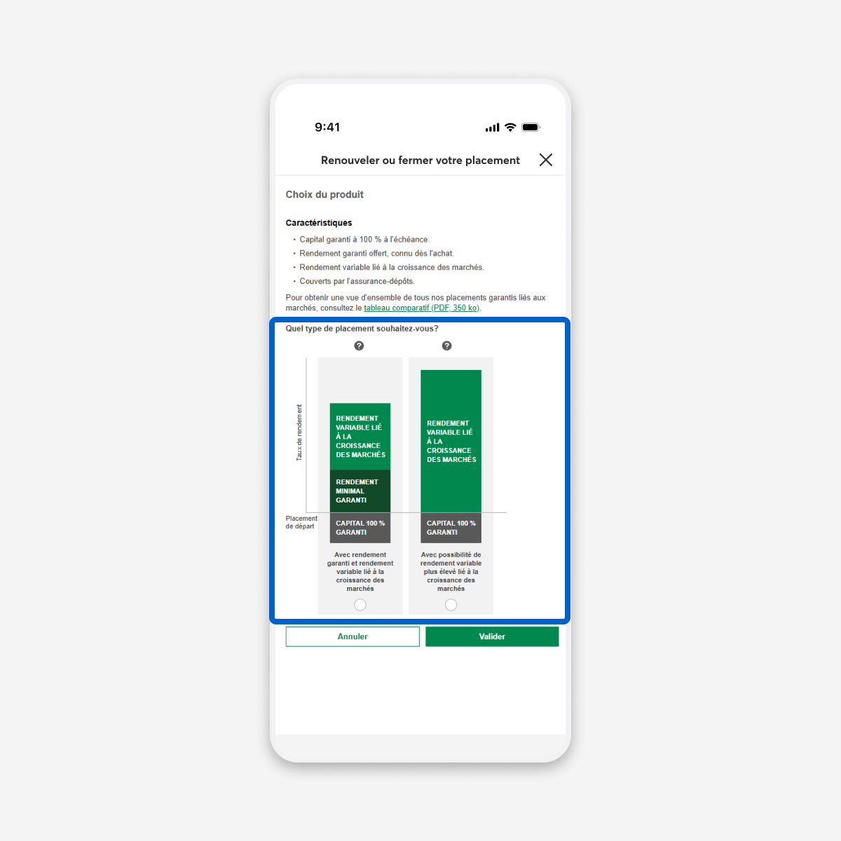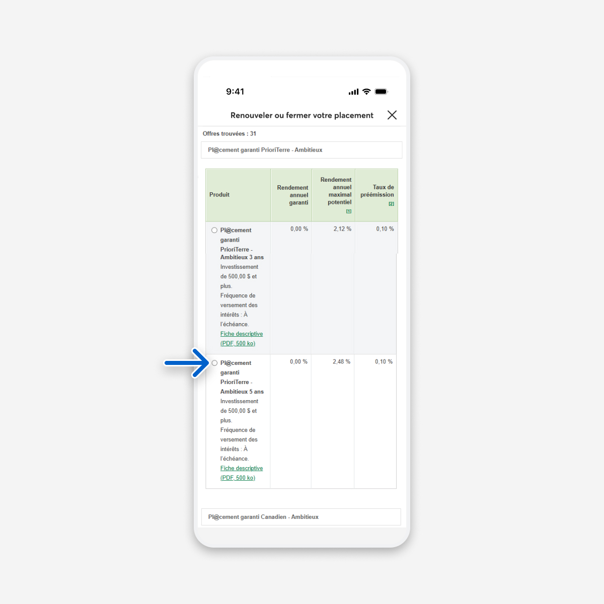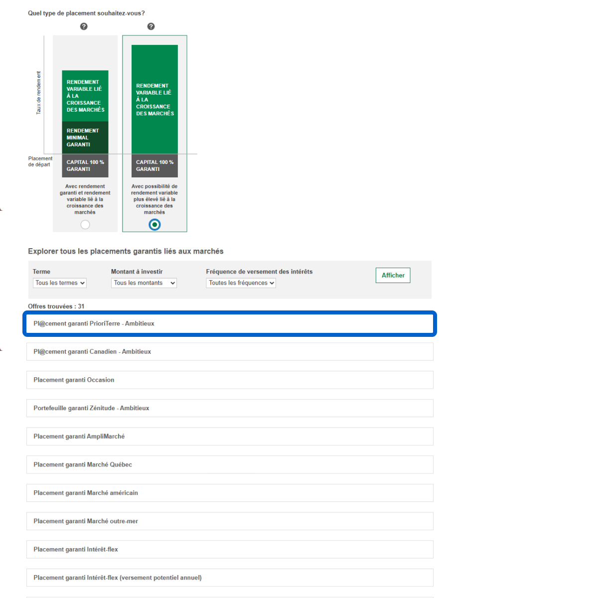 Dans la page Renouveler dans un nouveau placement garanti lié aux marchés, choisissez le bouton radio du type de placement que vous voulez pour afficher la liste des offres.