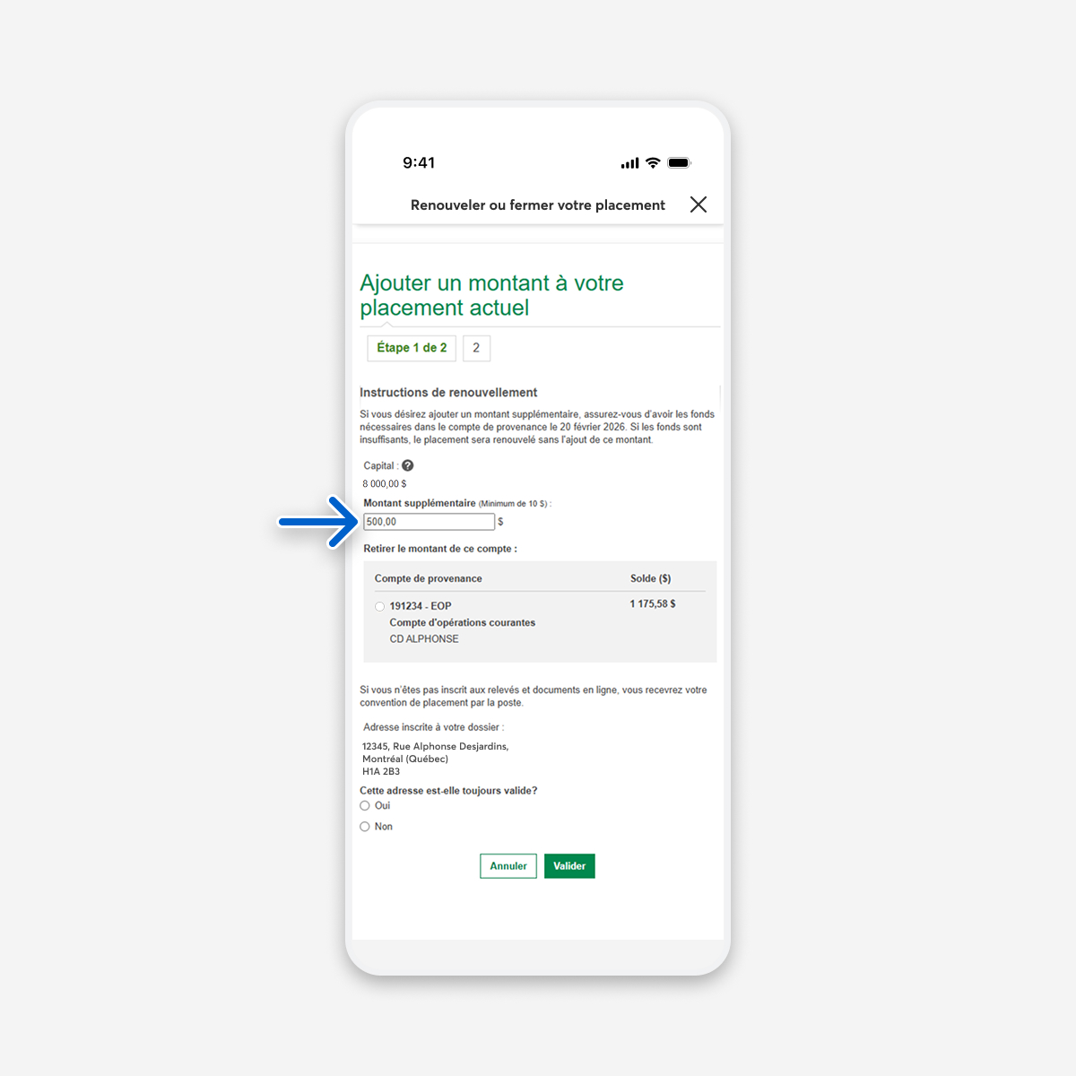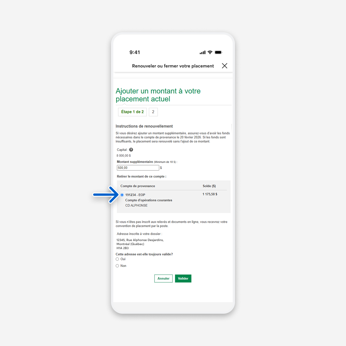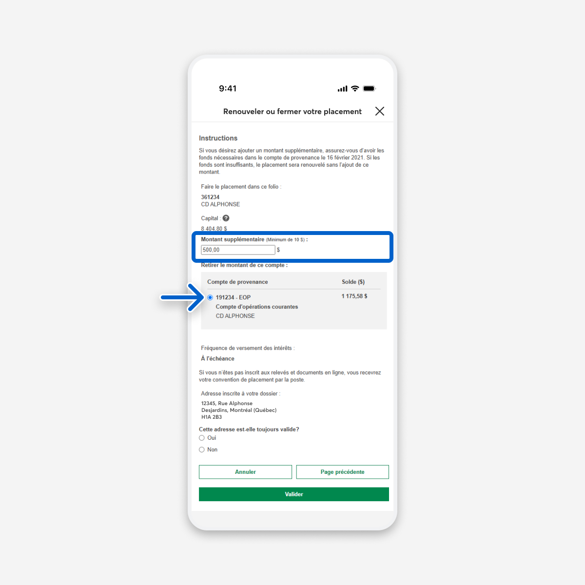 Dans la page Ajouter un montant à votre placement actuel, entrez le montant supplémentaire, puis sélectionnez le compte de provenance.