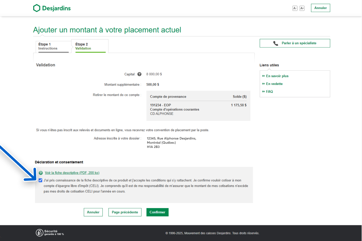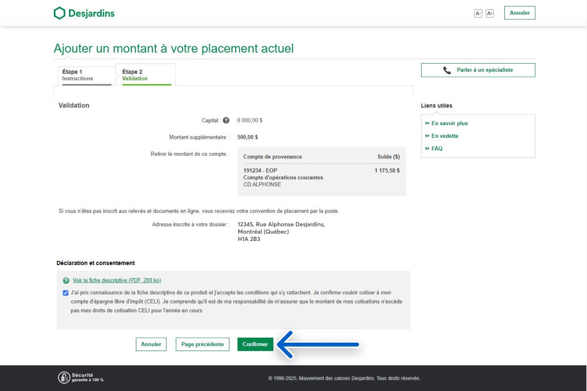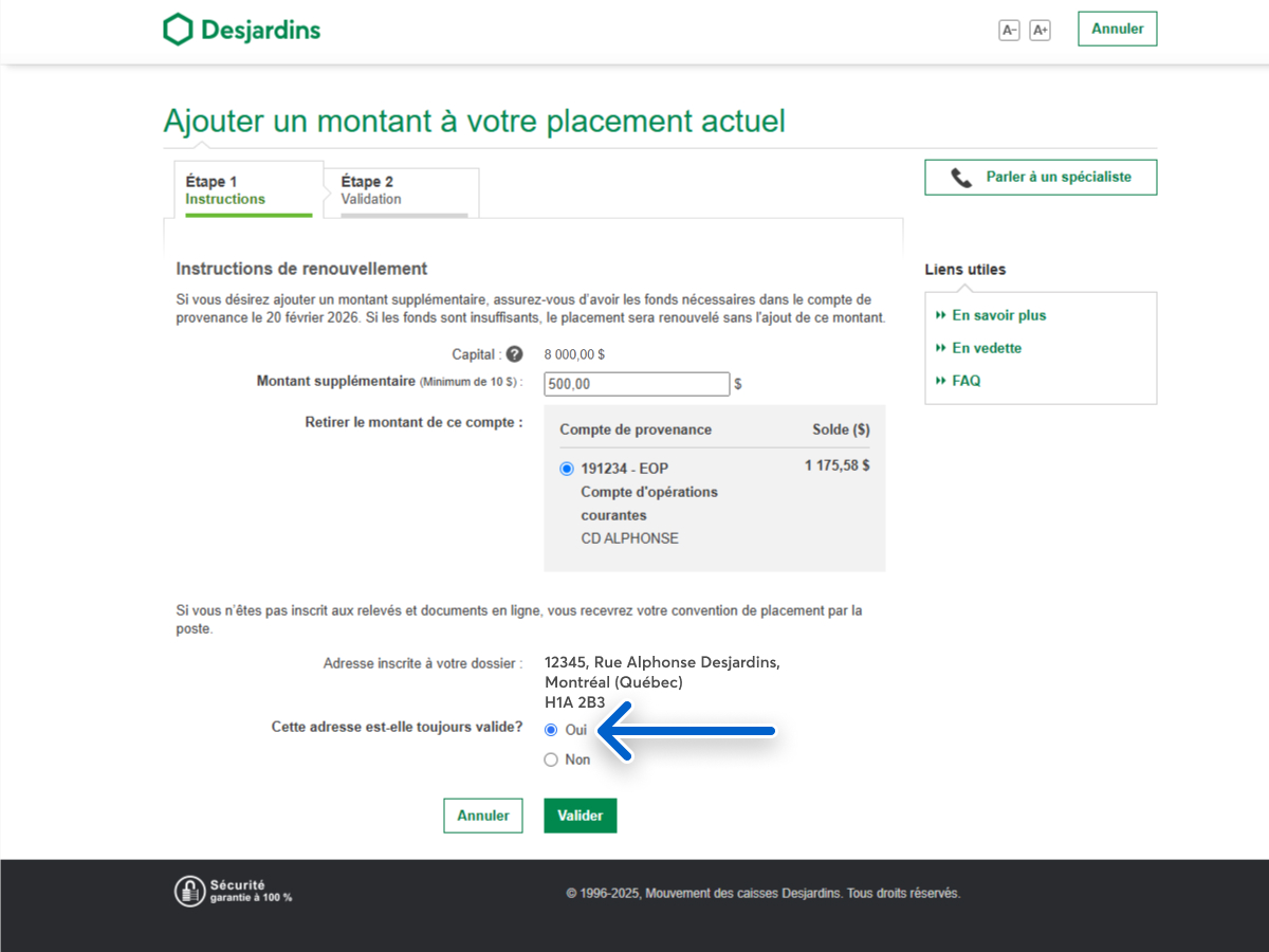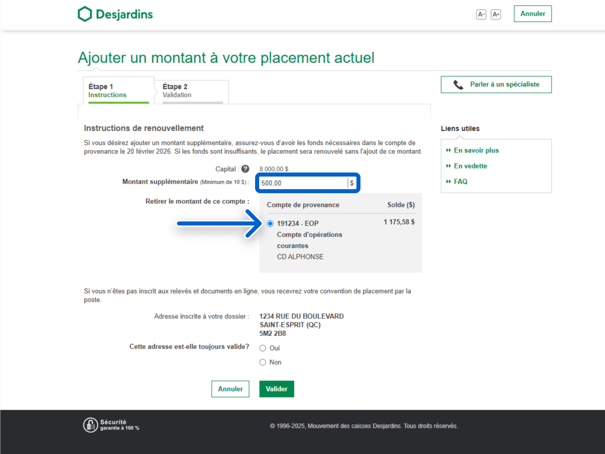 Dans la page Ajouter un montant à votre placement actuel, entrez le montant supplémentaire, puis sélectionnez le compte de provenance.