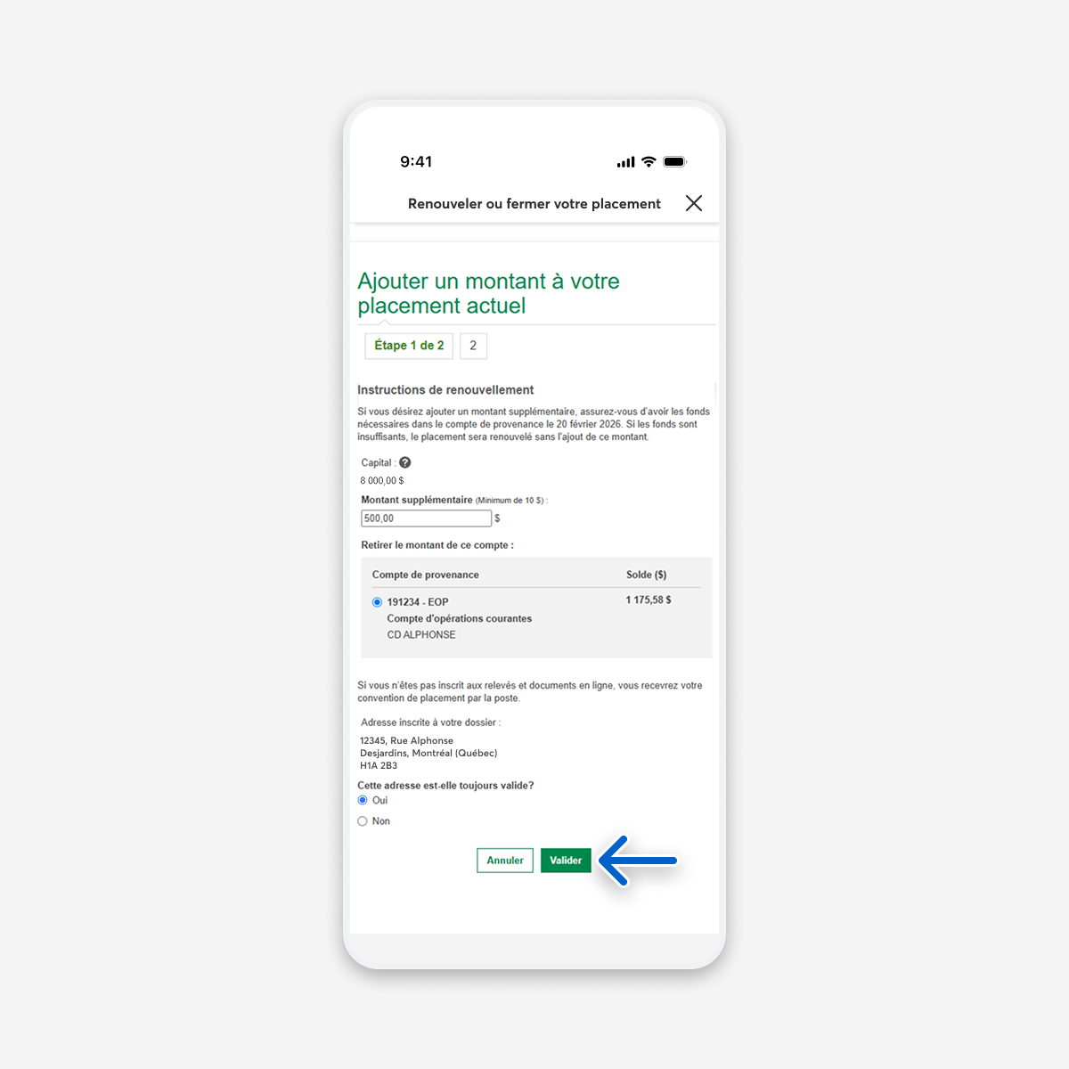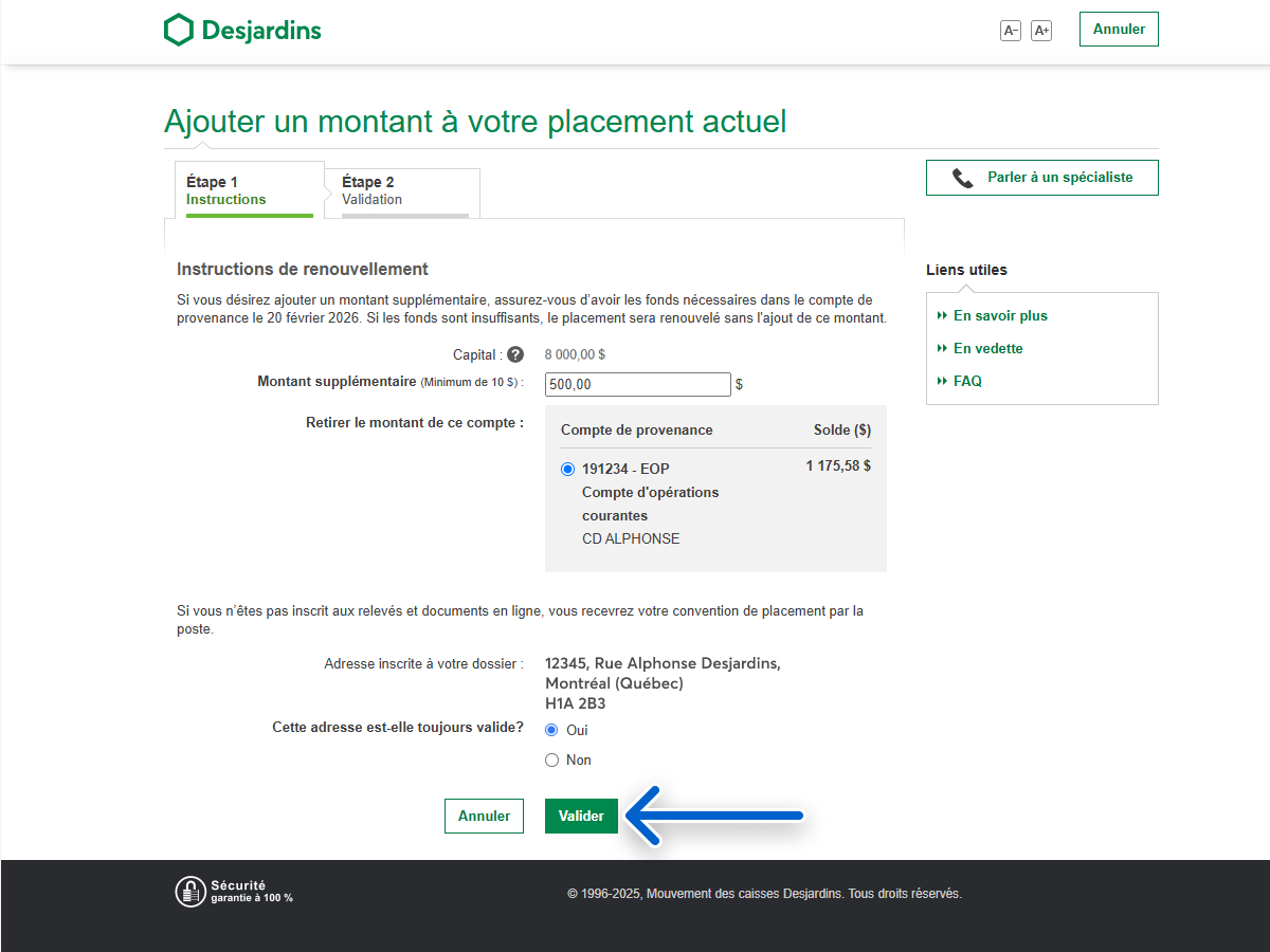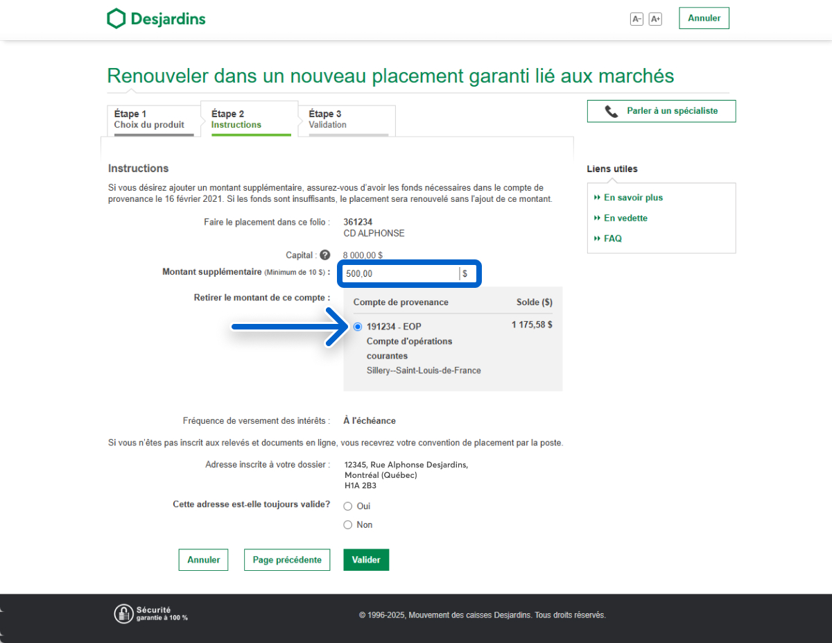 Si vous voulez ajouter un montant à votre placement, entrez-le dans le champ Montant supplémentaire, puis sélectionnez le compte de provenance.