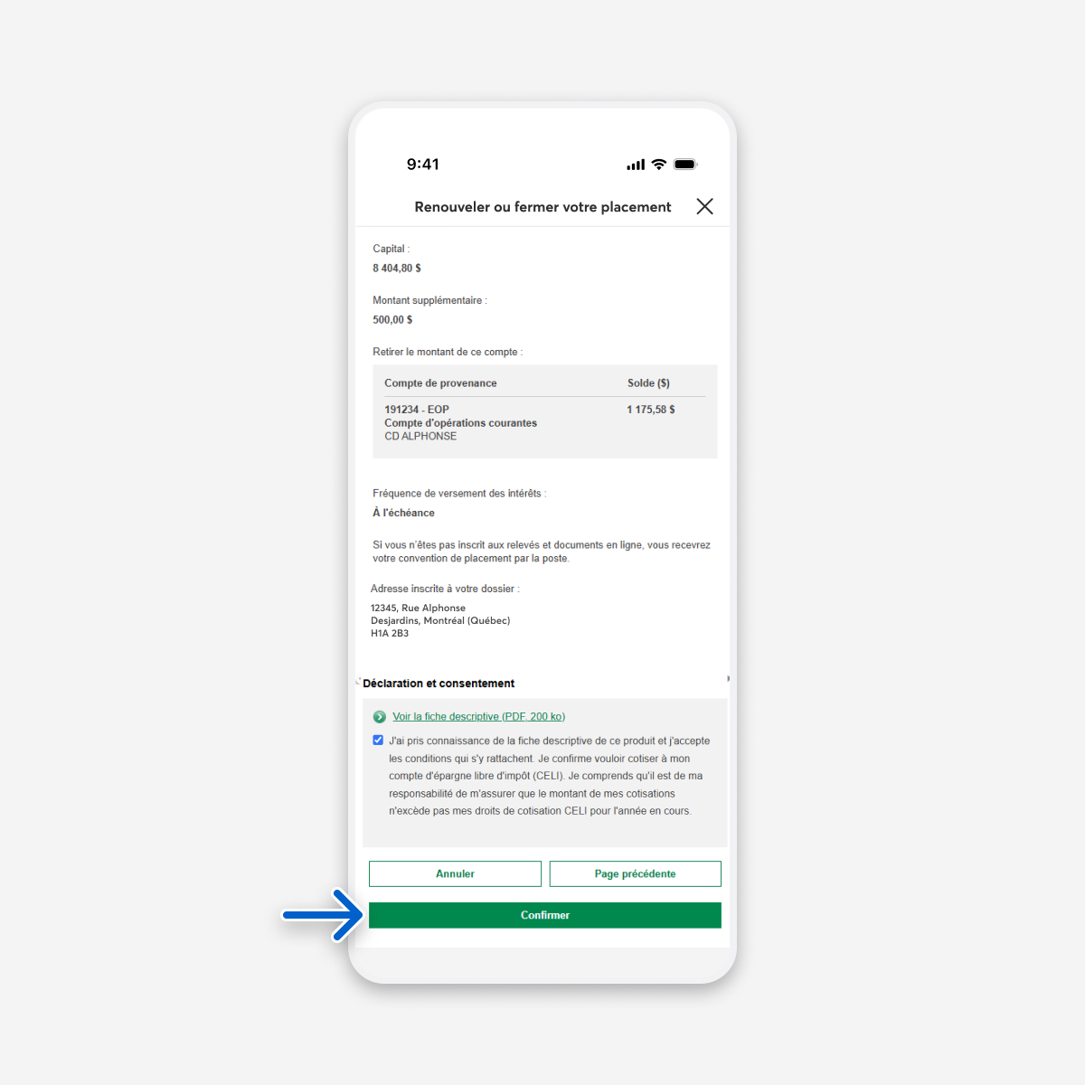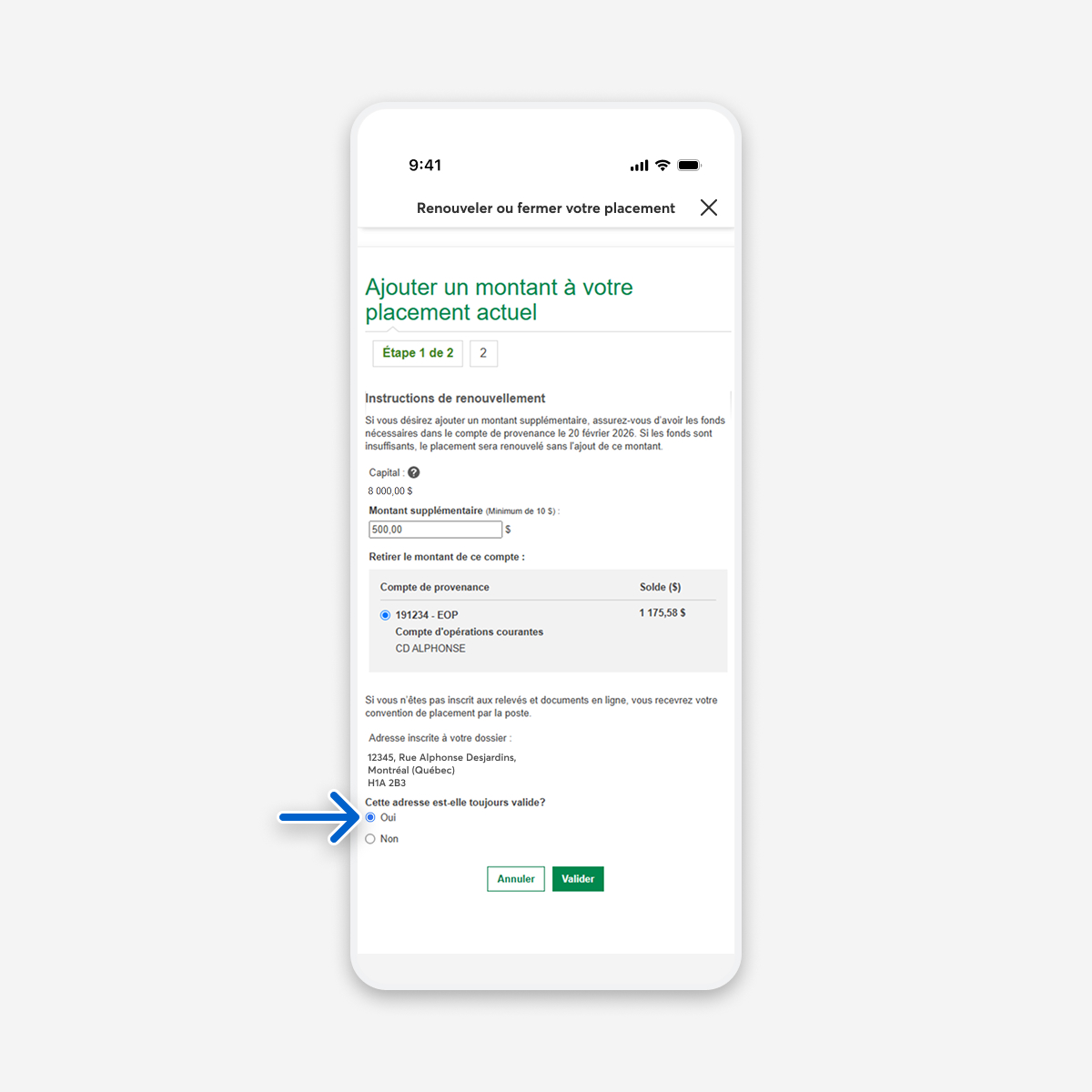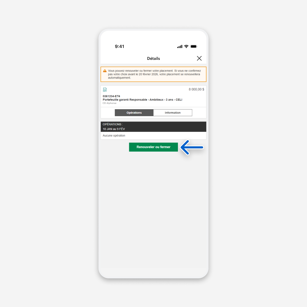 Si votre placement est admissible au renouvellement en ligne, un rappel apparaît sous votre épargne dans la liste de vos comptes pour vous aviser que le renouvellement est disponible. Vous pouvez choisir votre option de renouvellement quelques semaines avant l’échéance, mais vous devez attendre à la date d’échéance pour que le renouvellement s’applique.