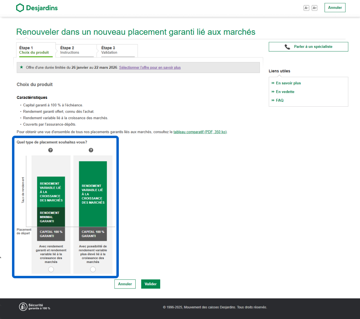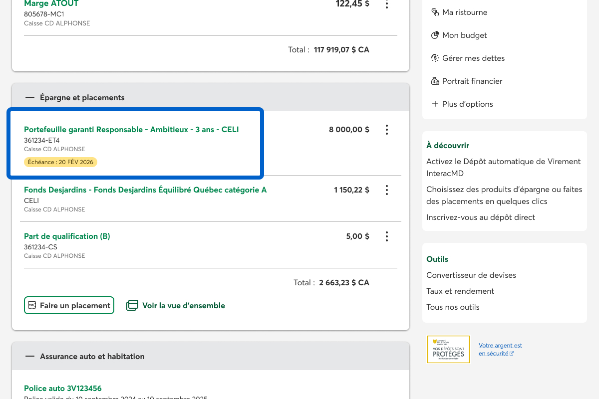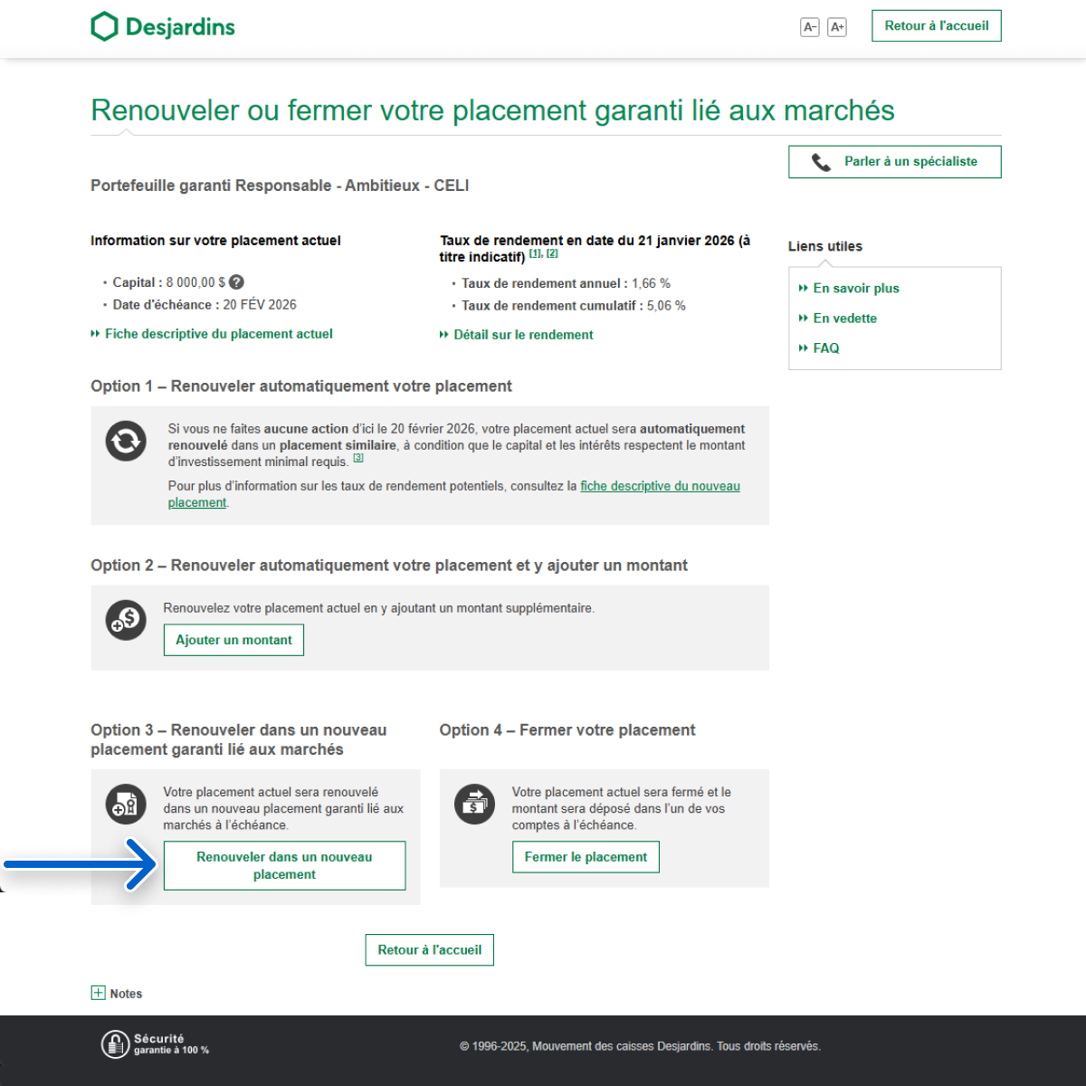 Dans la page d’accueil d’AccèsD, sous Épargne et placements, sélectionnez le placement garanti lié aux marchés que vous voulez renouveler.