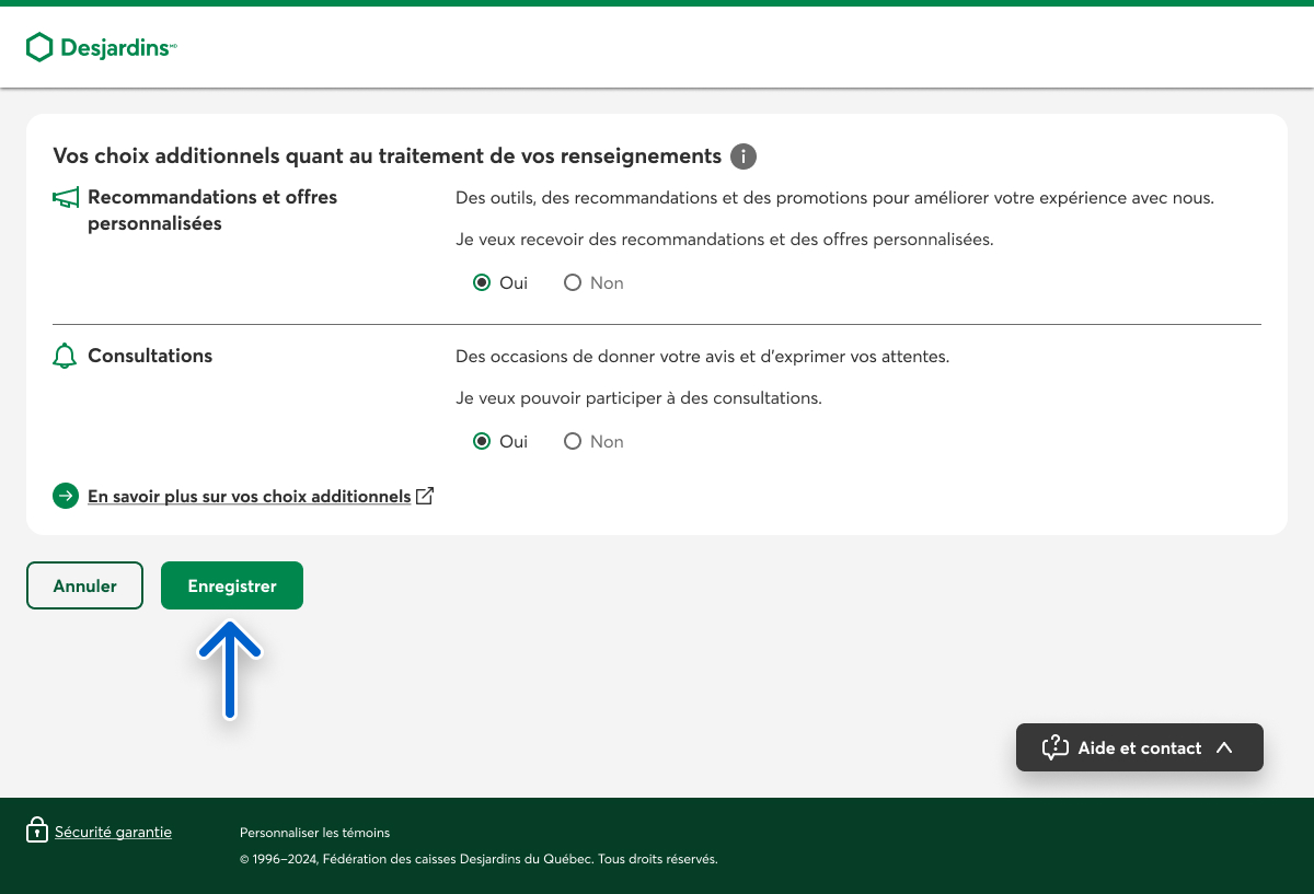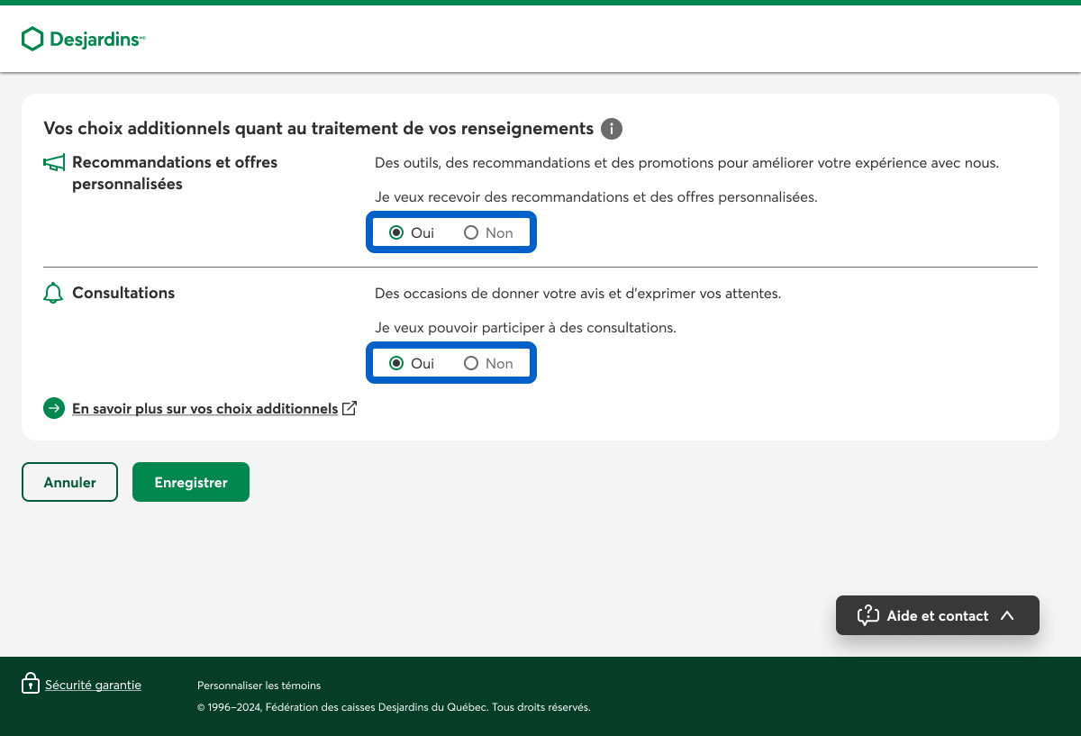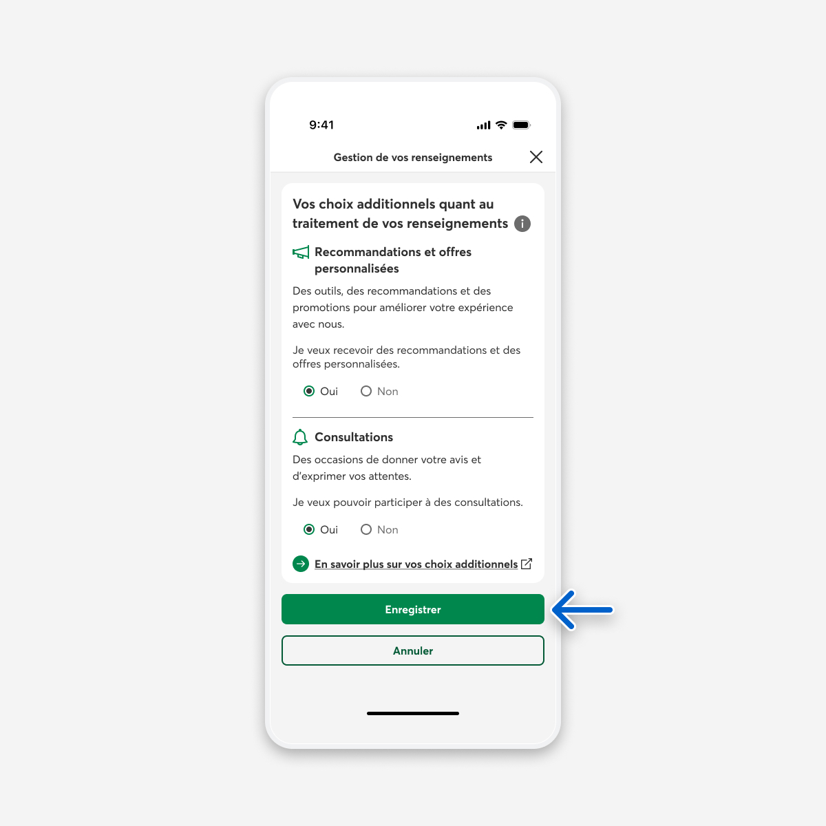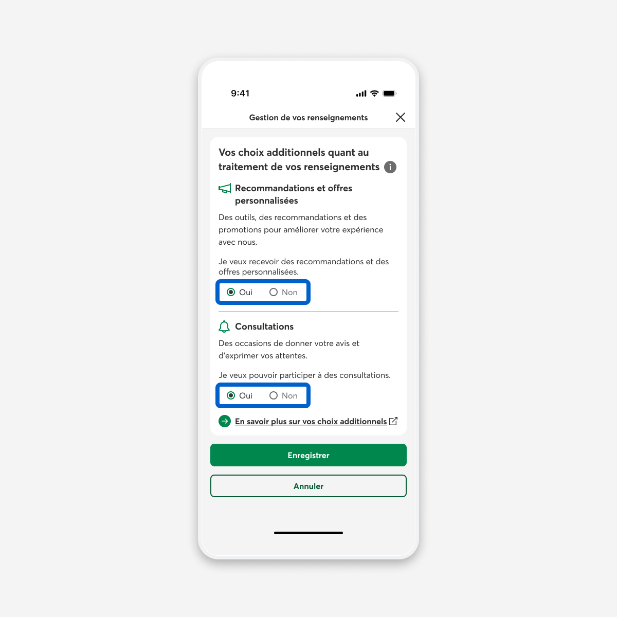 Dans la section Vos choix additionnels quant au traitement de vos renseignements, sous chacun des consentements que vous voulez modifier, cochez le bouton Oui ou Non.