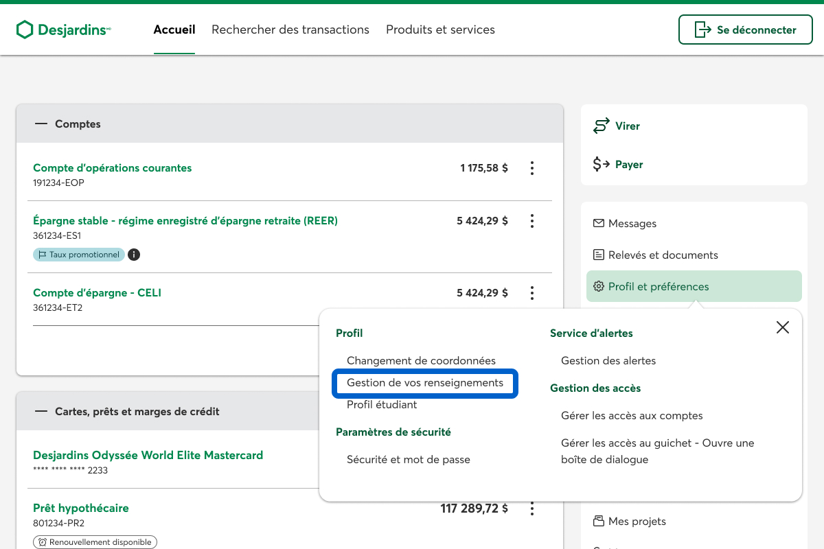 Dans la page Profil et réglages, sous Profil, sélectionnez le bouton Gestion de vos renseignements.