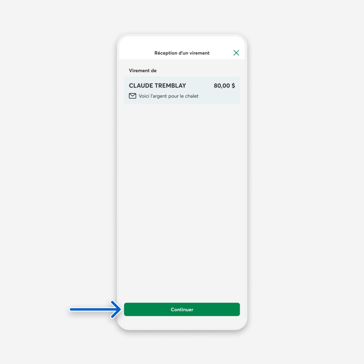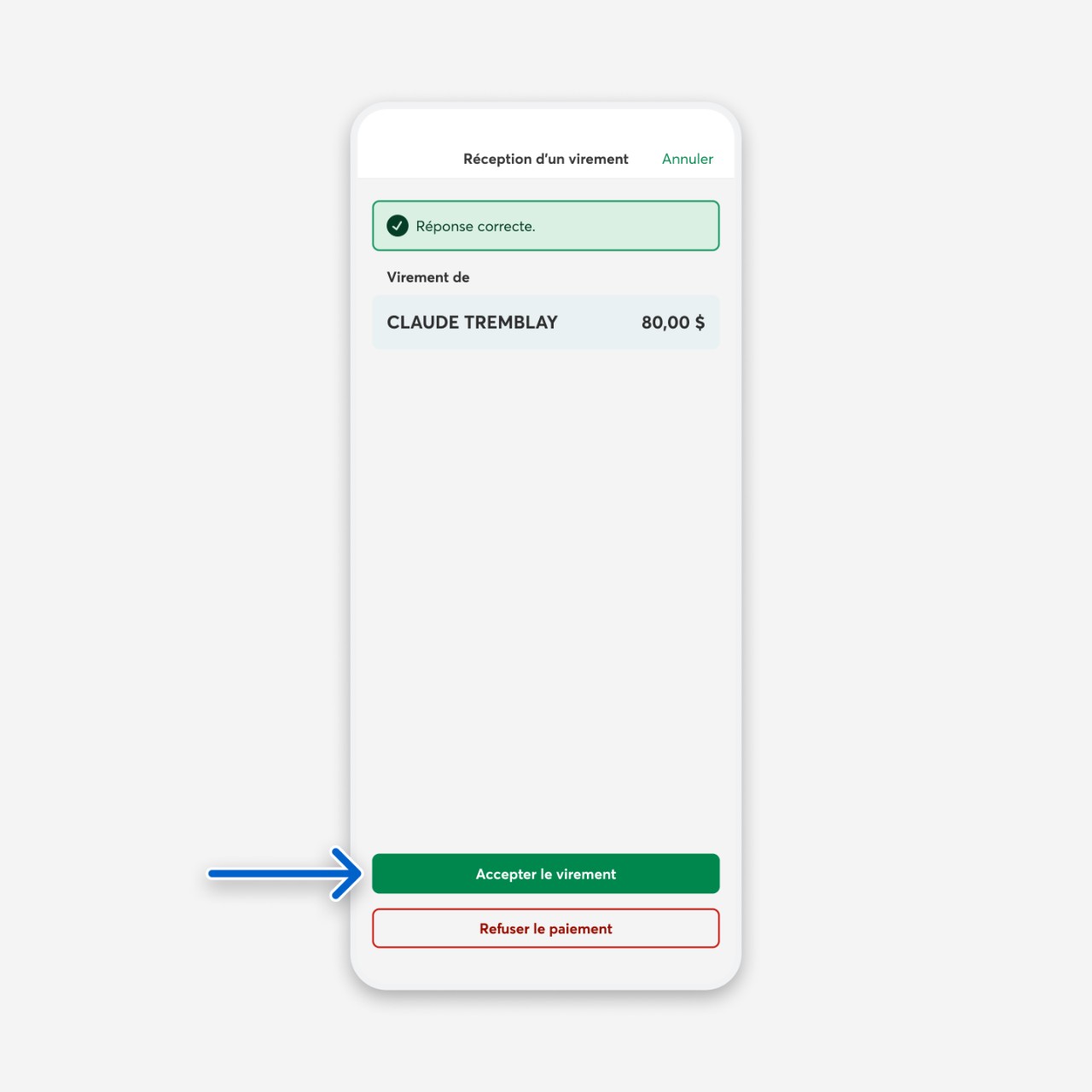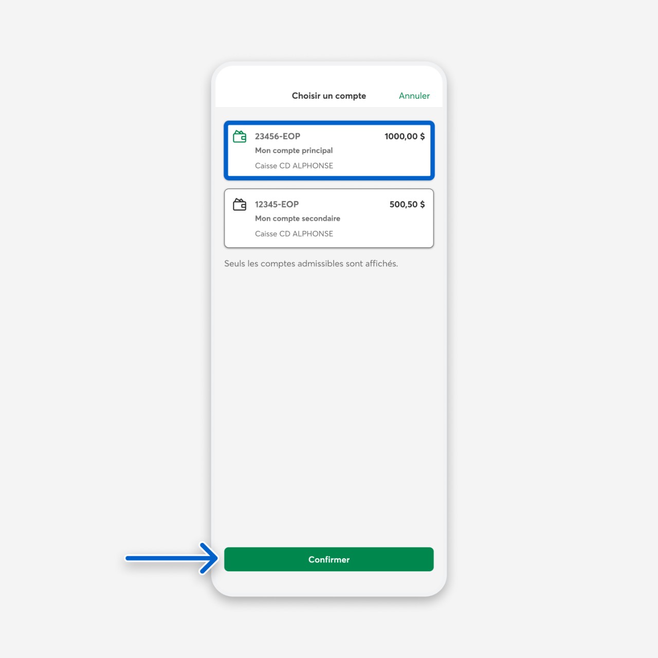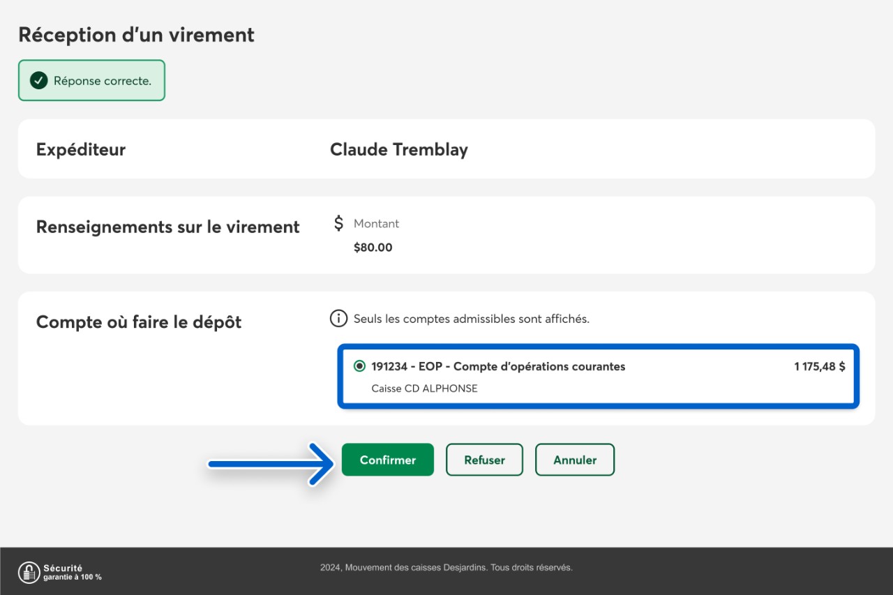 Choisissez le compte où faire le dépôt, puis sélectionnez le bouton Confirmer pour accepter le Virement Interac.