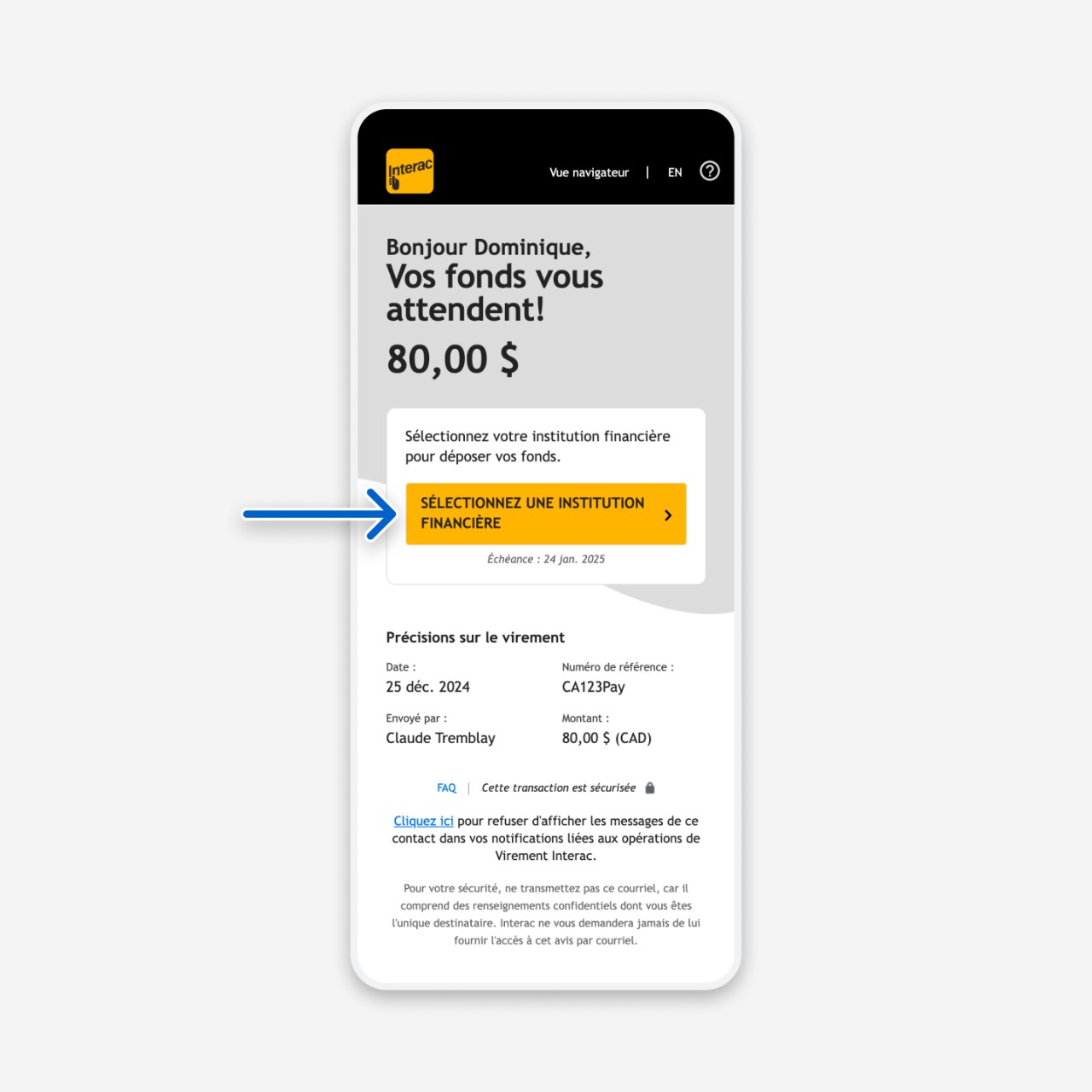 Ouvrez le courriel reçu d’Interac et sélectionnez le lien Sélectionnez une institution financière.