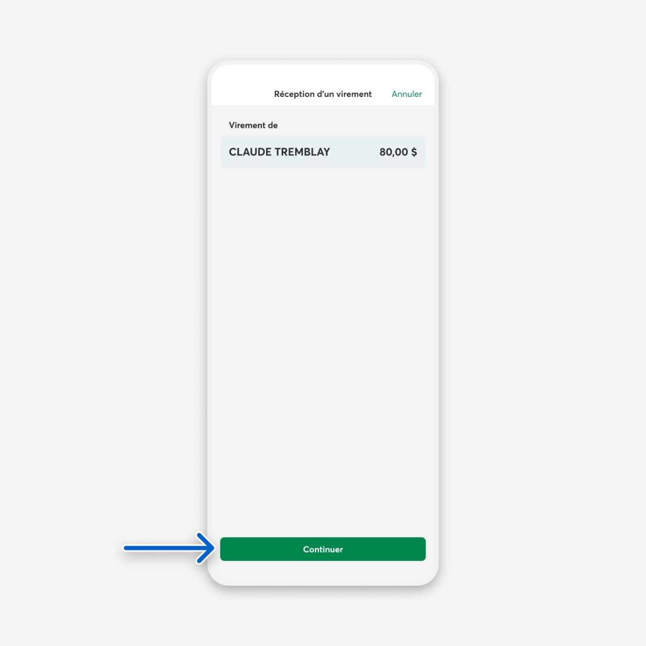 Dans la page Réception d’un virement, sélectionnez le bouton Continuer.