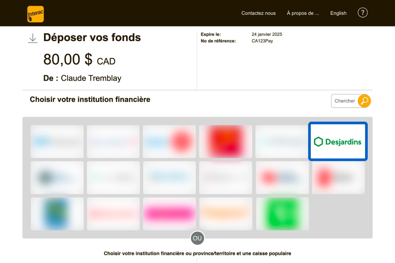 Dans la page Déposer vos fonds du site d’Interac, choisissez Desjardins parmi les institutions financières proposées.