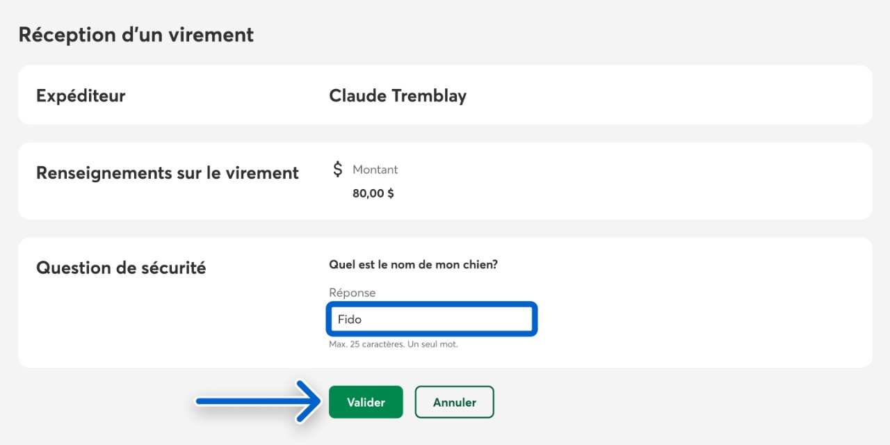 Dans la page Réception d’un virement, entrez la réponse à la question de sécurité et sélectionnez le bouton Valider.