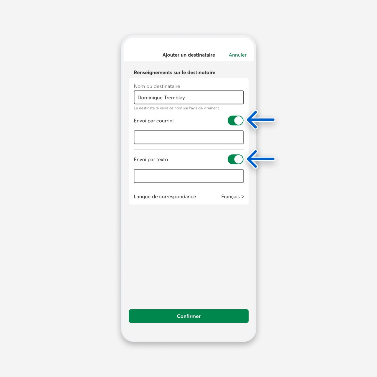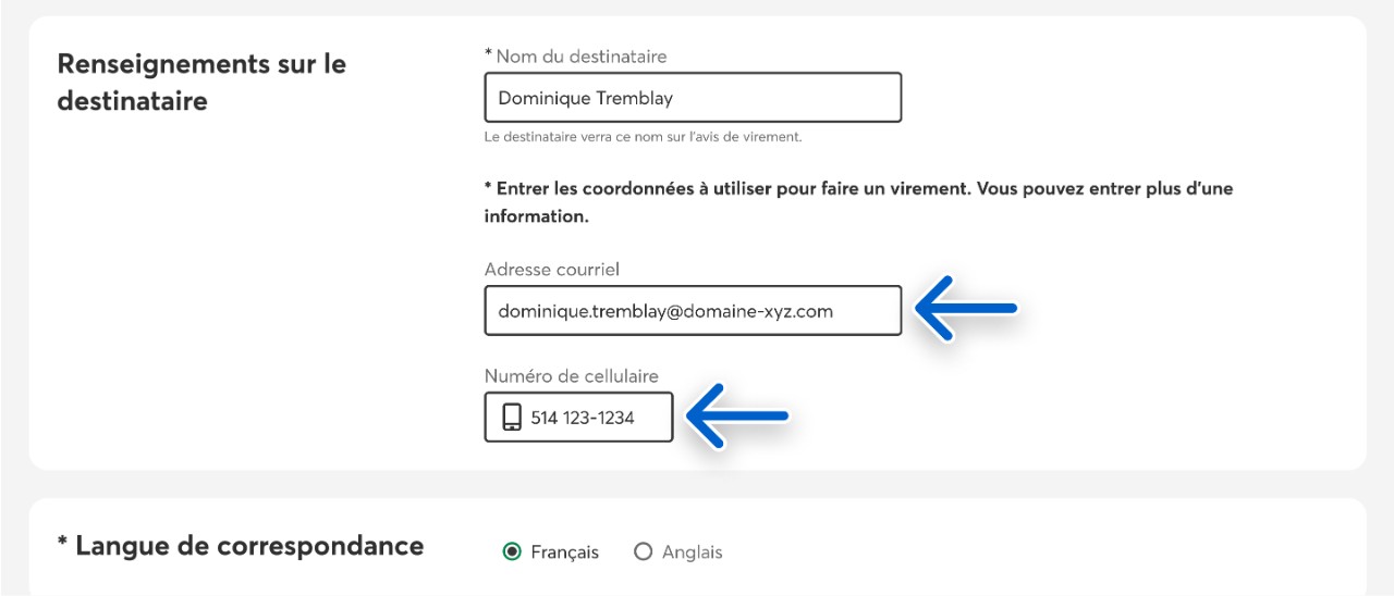 Entrez l’adresse courriel ou le numéro de cellulaire de votre destinataire. Ces coordonnées seront utilisées pour lui envoyer les Virements Interac