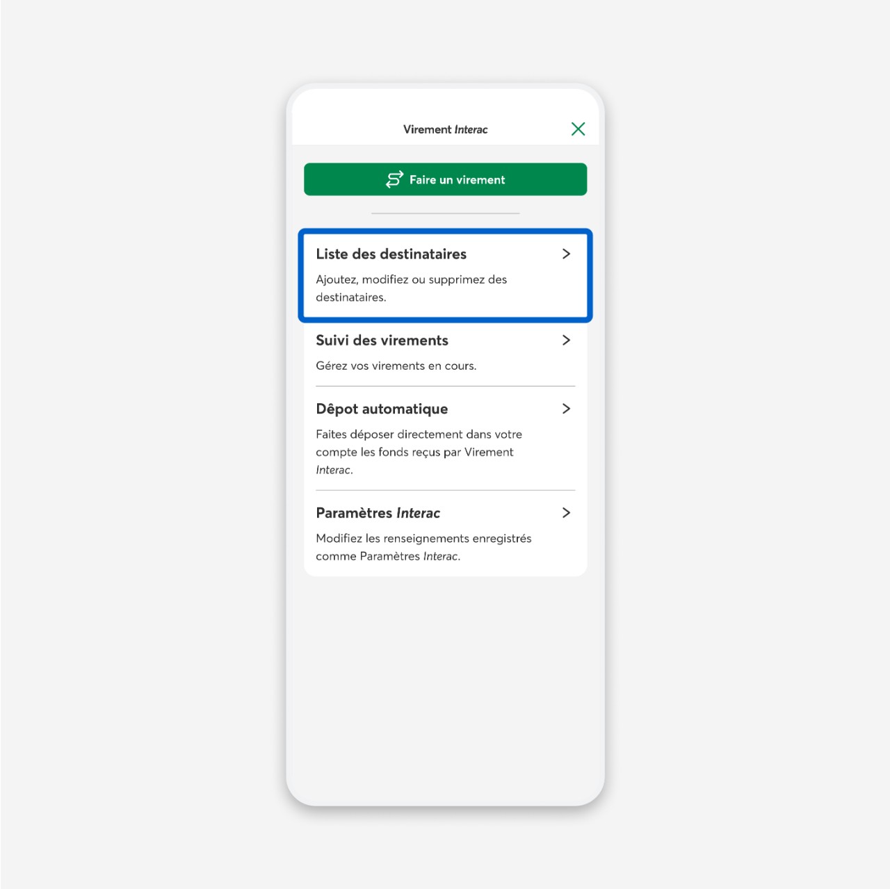 Dans la page Virement Interac, sélectionnez Liste des destinataires.