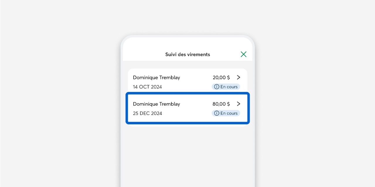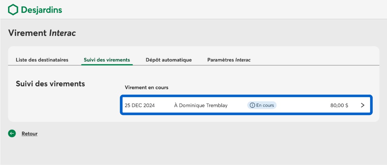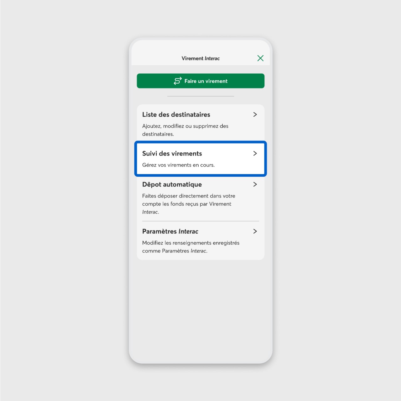 Dans la page Virement Interac, sélectionnez Suivi des virements.