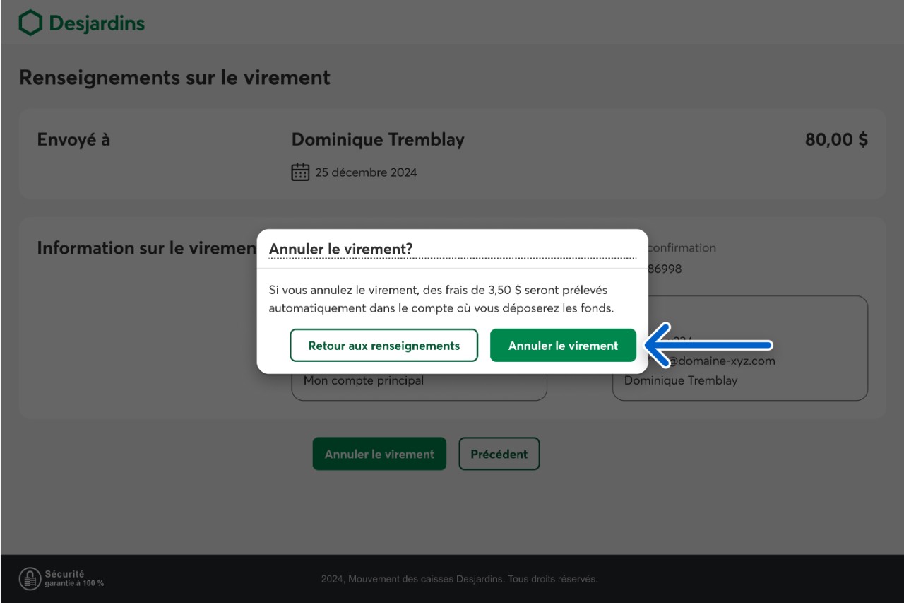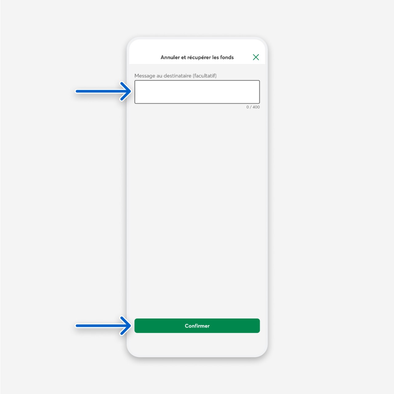 Écrivez un message à votre destinataire si vous le souhaitez, et sélectionnez le bouton Confirmer pour annuler le Virement Interac et récupérer les fonds.