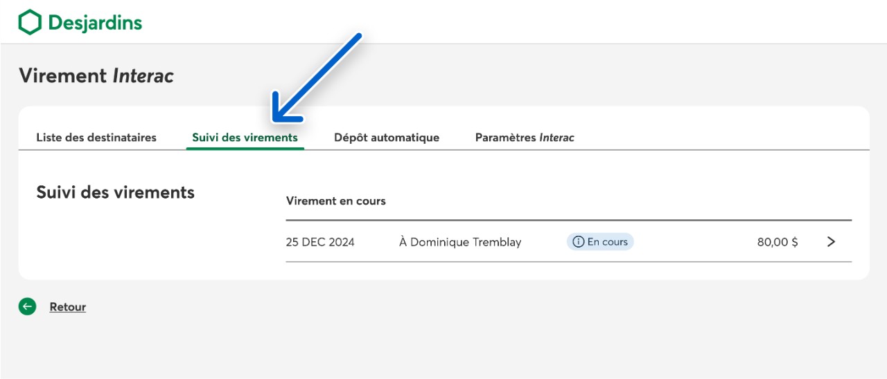 Dans la page Virement Interac, sélectionnez l’onglet Suivi des virements.