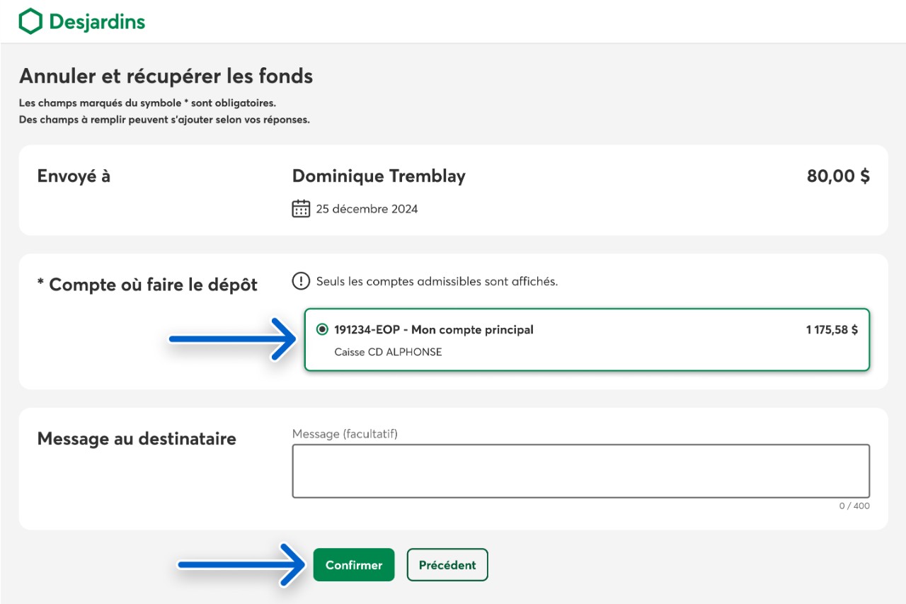 Sélectionnez le compte où faire le dépôt, puis le bouton Confirmer pour annuler le Virement Interac et récupérer les fonds.