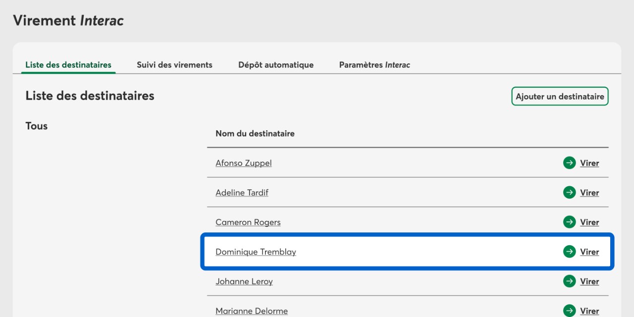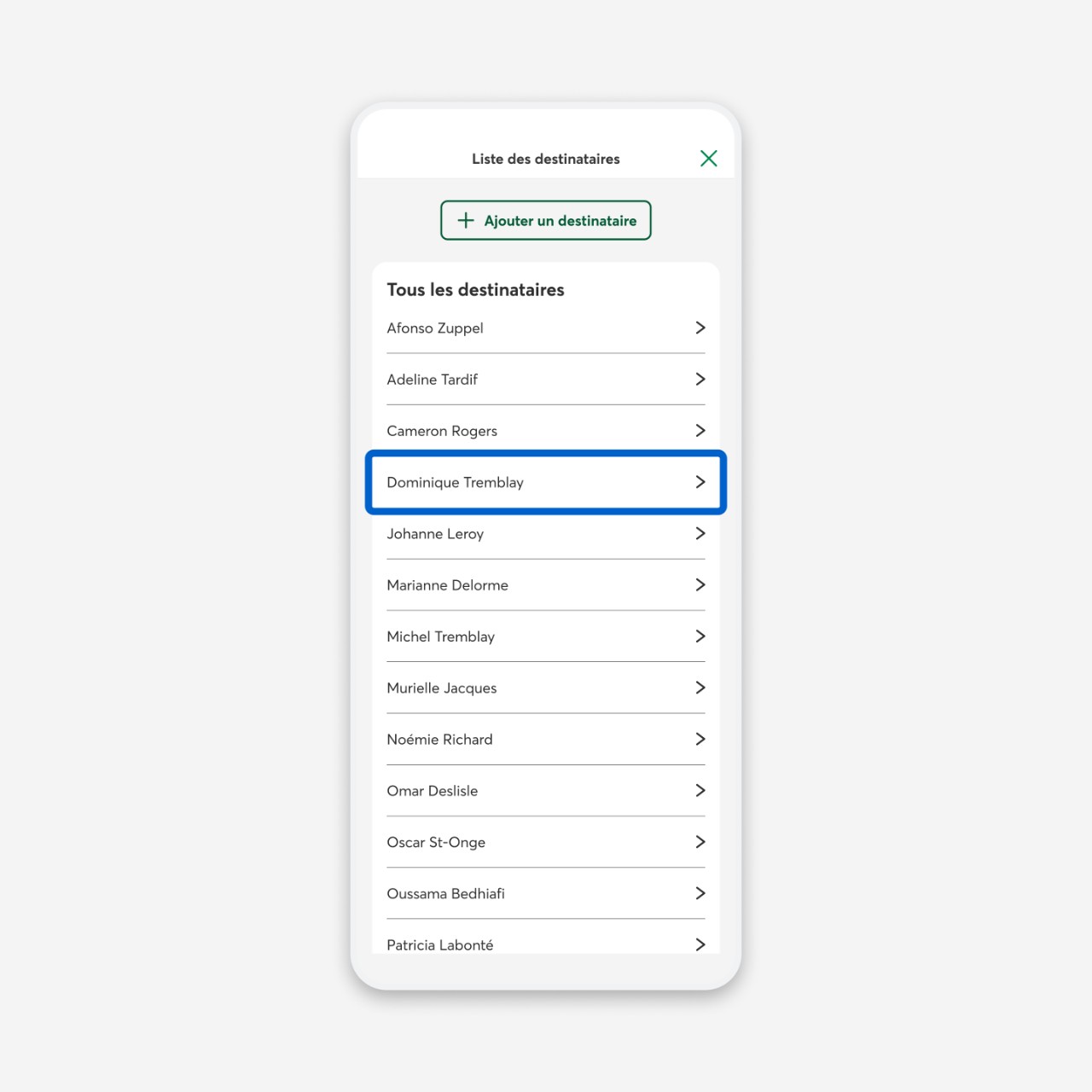 Si votre contact n’est pas dans la liste, vous pouvez ajouter un ou une destinataire avant de faire votre Virement Interac.