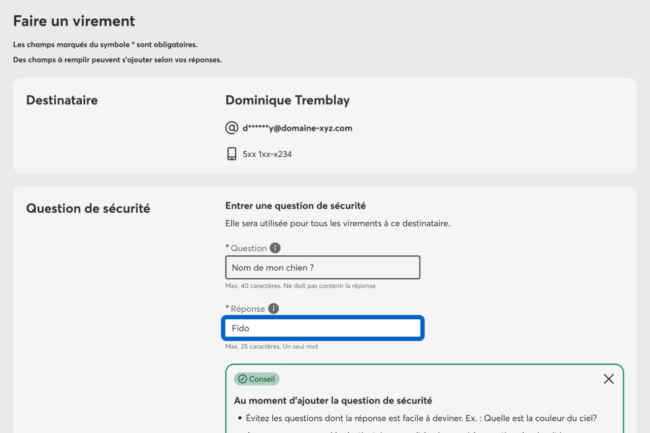 Dans la page Faire un virement, entrez votre question de sécurité dans le champ Question. Votre destinataire devra répondre à cette question pour accepter le Virement Interac.