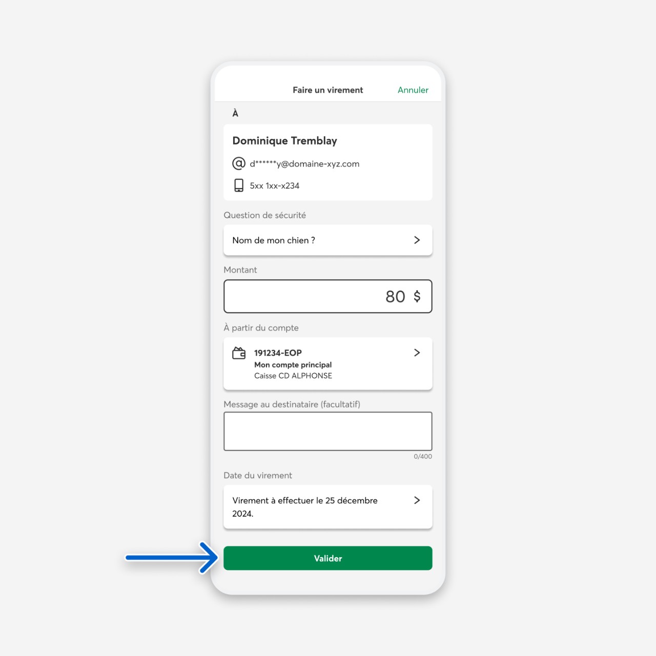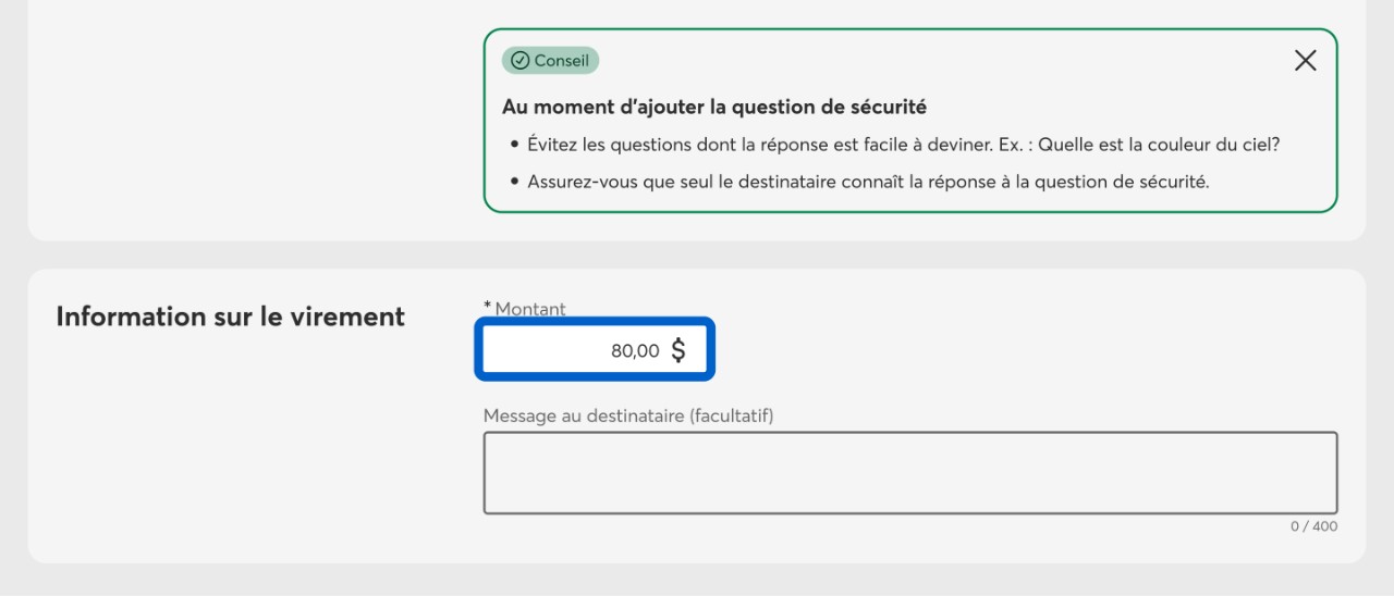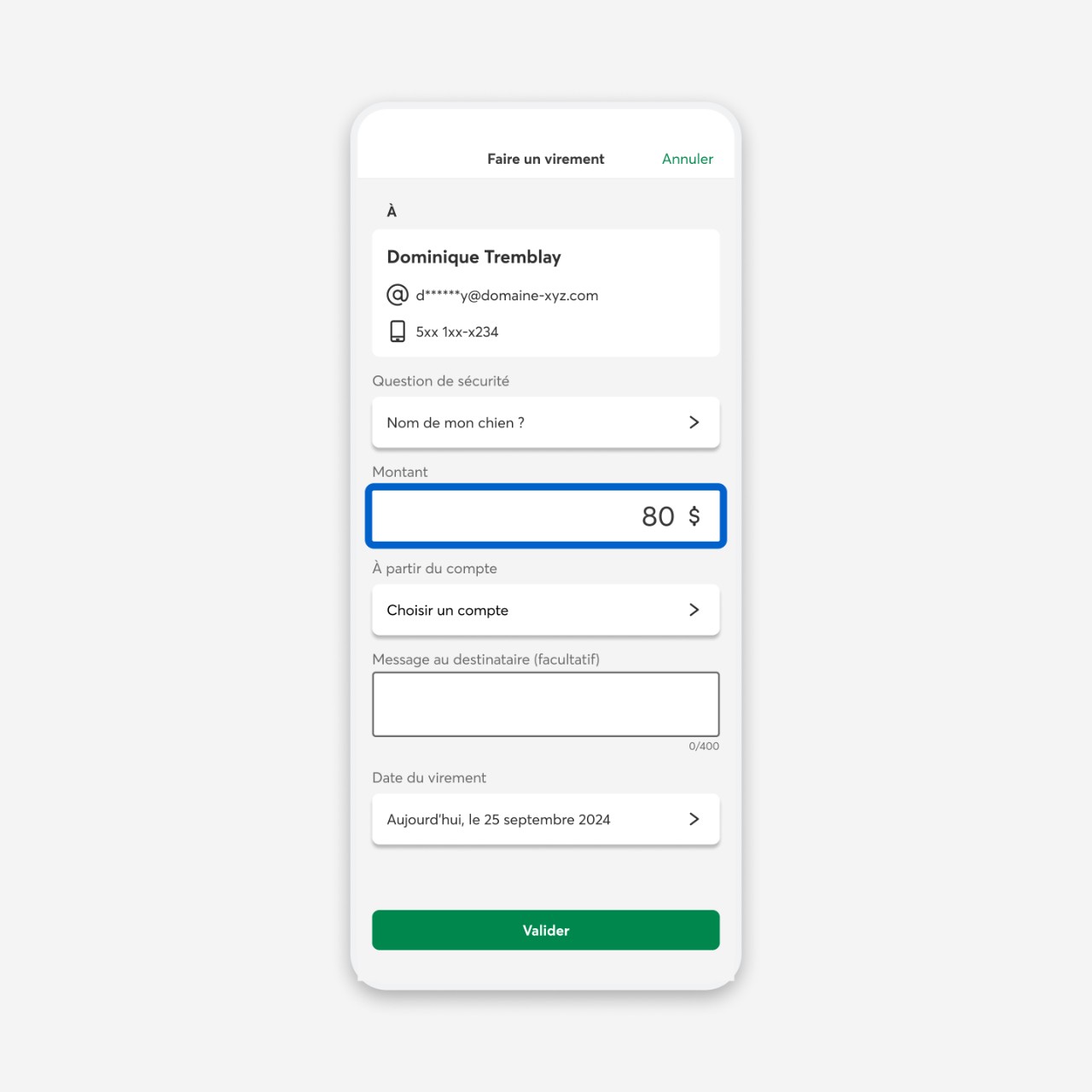 Dans le champ Montant, entrez le montant de votre Virement Interac.