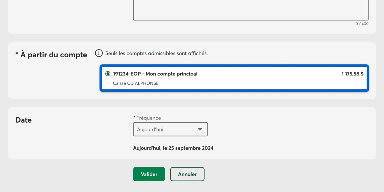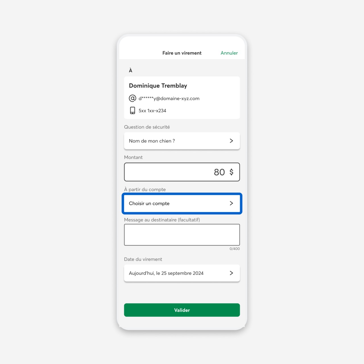 Sélectionnez le compte à partir duquel vous voulez faire votre Virement Interac, puis le bouton Valider.
